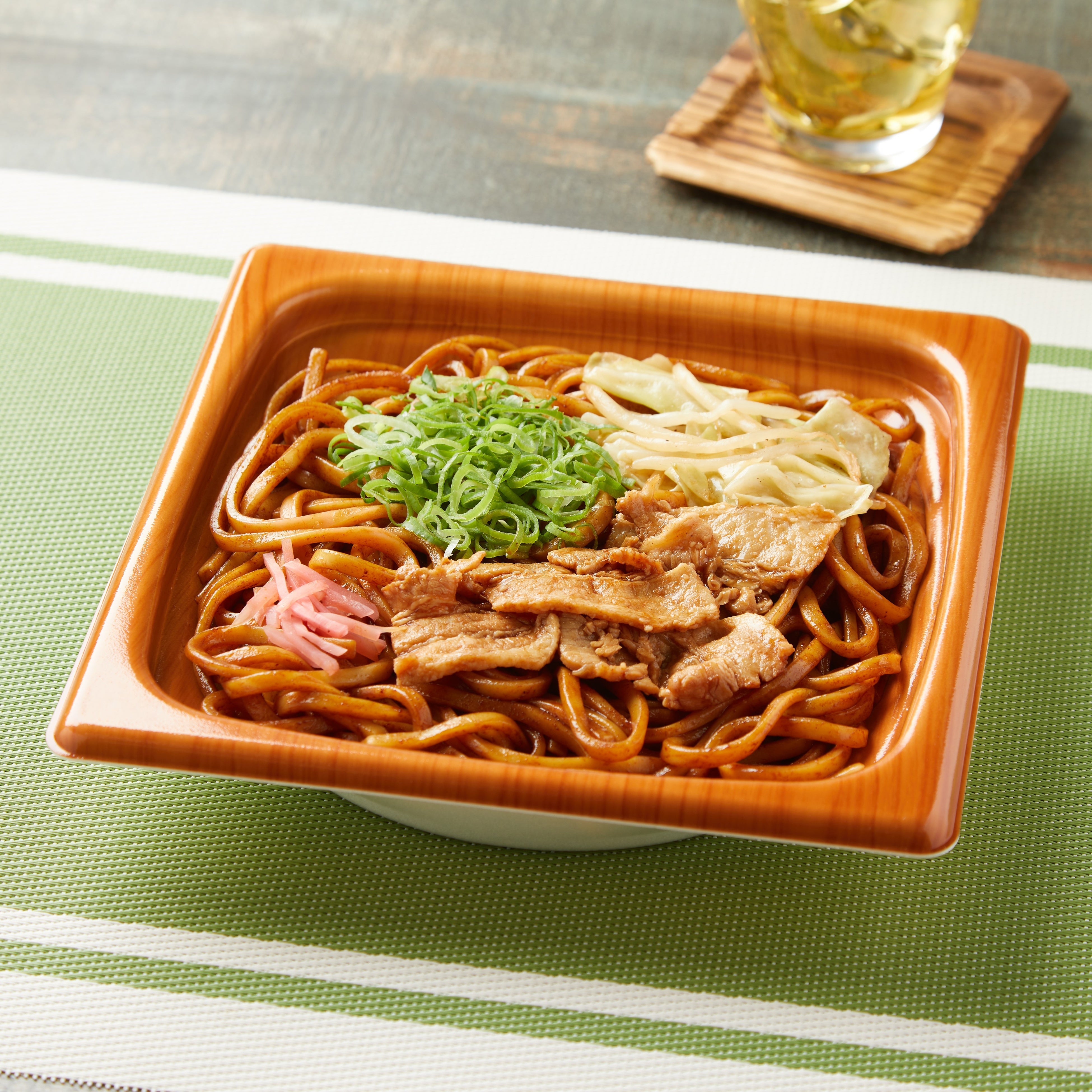 【内容】豚肉炒め、野菜炒め、青ねぎ、紅しょうがをトッピングした大盛タイプの焼きそばです。太麺によくからむ、甘口のこってりしたソースで味付けしました。