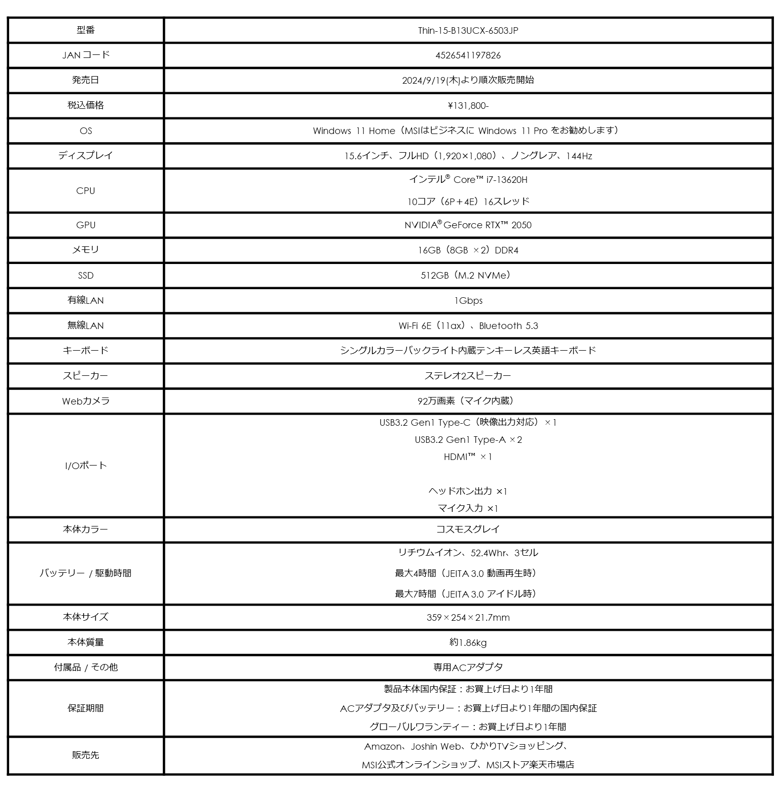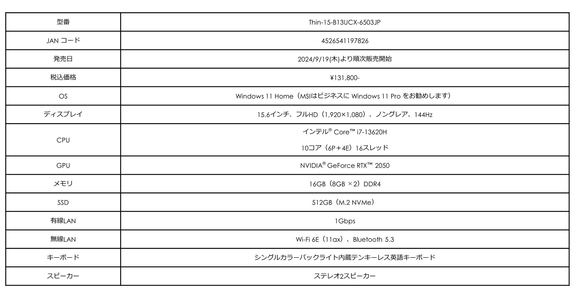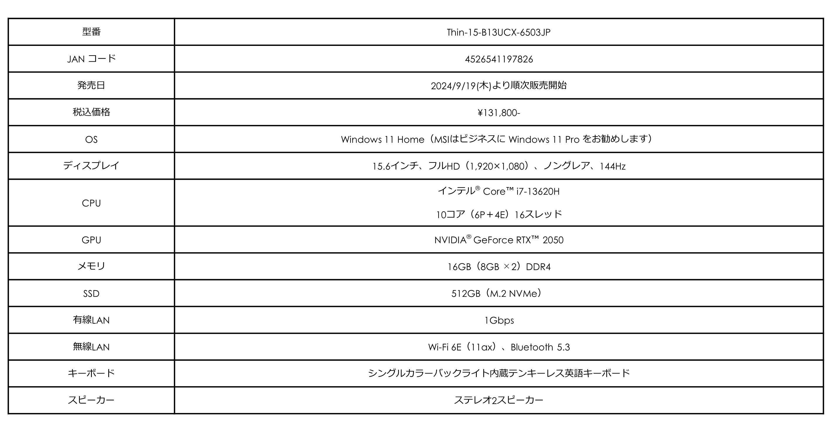 【Thin-15-B13UCX-6503JPの主な特徴】