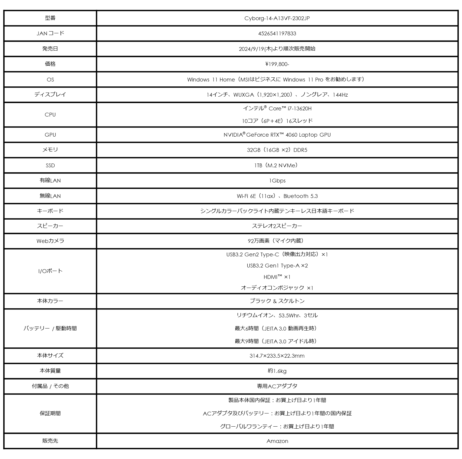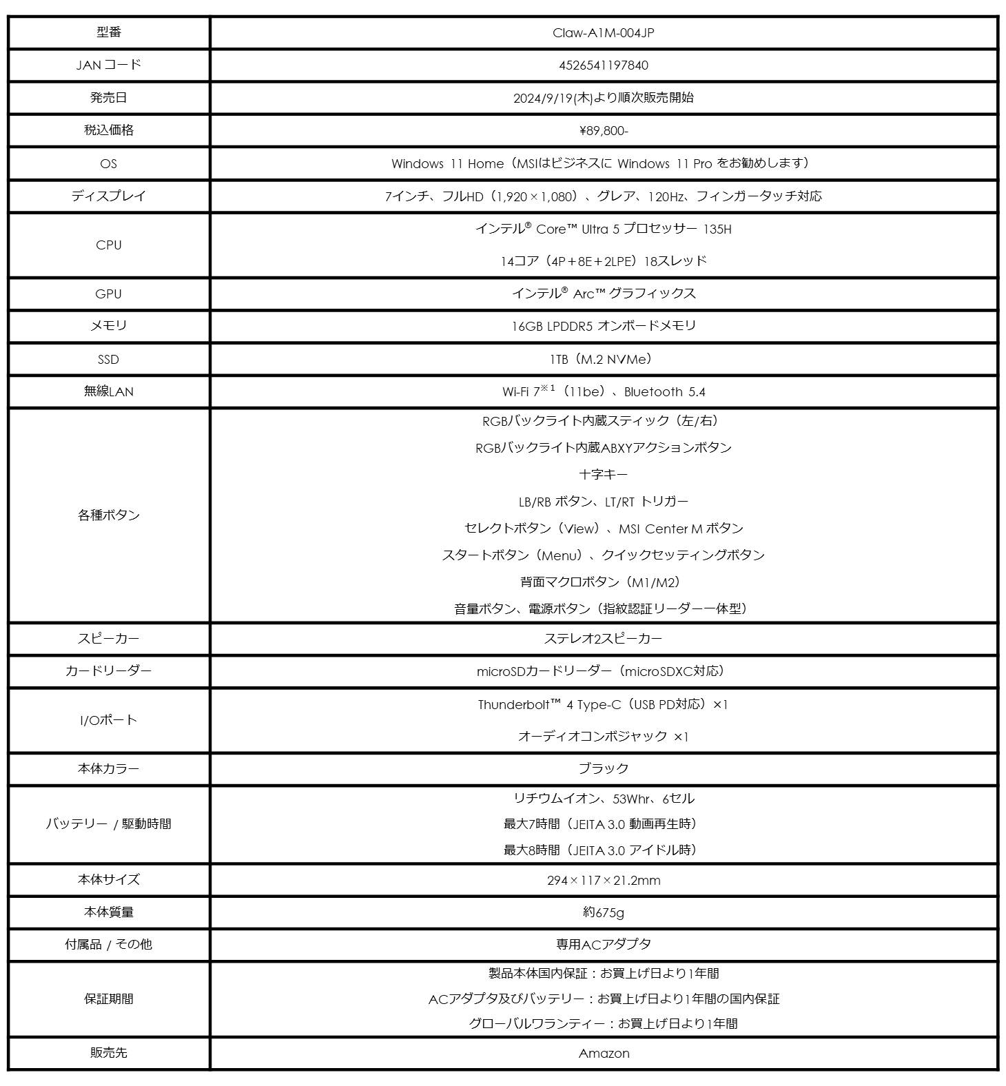 また、14インチクラスのコンパクトな本体で日本国内で大人気のゲーミングノートPC「Cyborg 14 A13V」シリーズのAmazon限定モデル「Cyborg-14-A13VF-2302JP」と、MSI初のポータブルゲーミングPCとして話題となった「Claw A1M」のCore™ Ultra 5モデルのストレージを1TBに強化した「Claw-A1M-004JP」をAmazon限定で本日2024年9月19日(木)より発売いたします。