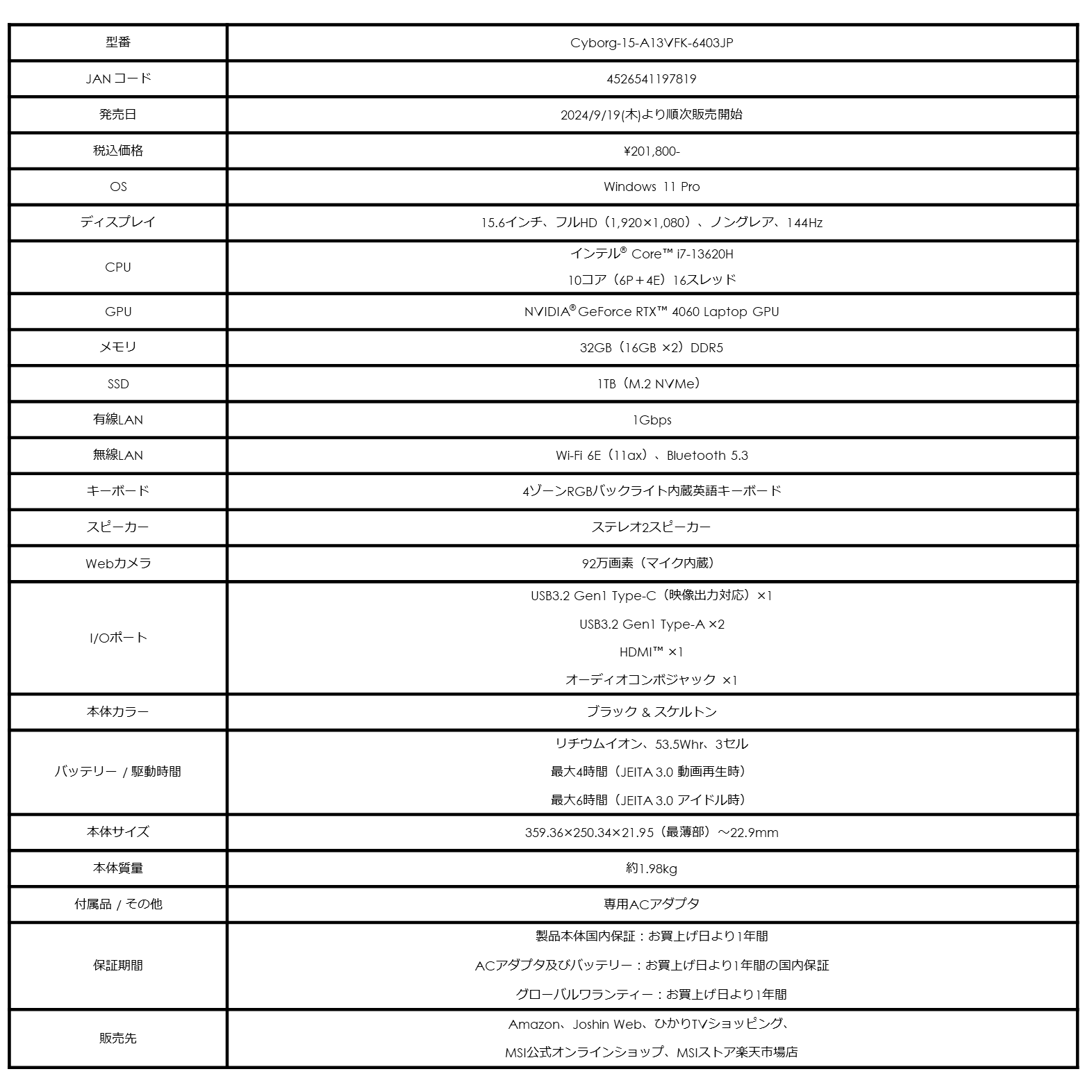 ・Cyborg 15 A13V シリーズ製品ページ:https://jp.msi.com/Laptop/Cyborg-15-A13VX