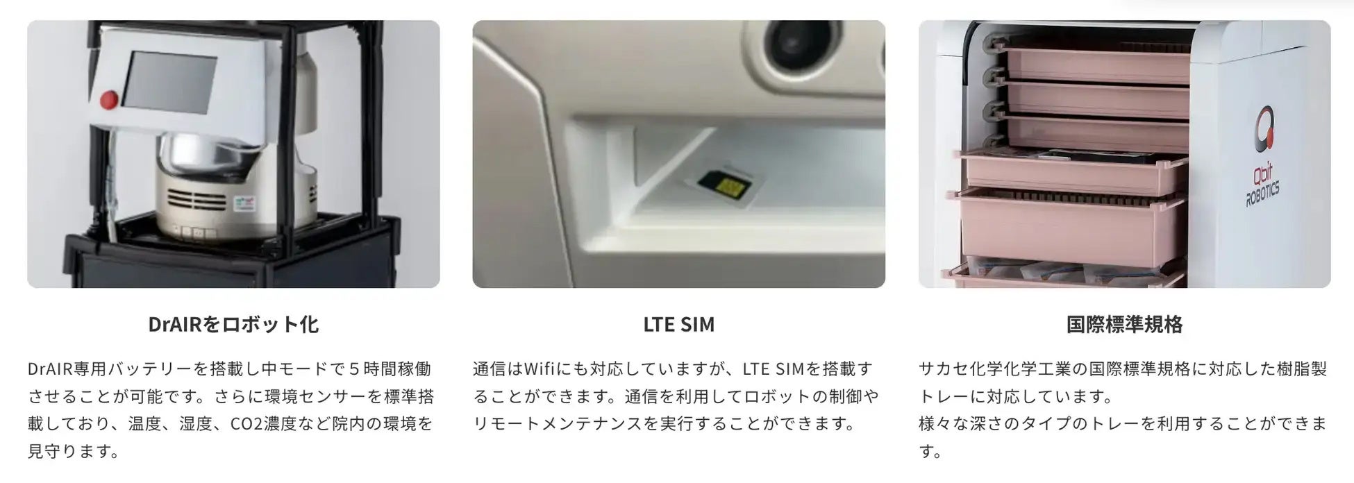 そこで、院内の小型荷物や書類などを運搬する「CareMover(ケアムーバー)」、 手術用の薬剤を運搬する「CareMedic(ケアメディック)」、 ウィルス除去ロボット「CareAir(ケアエア)」の3種をサブスクサービスをリリースいたしました。 これらが医療現場に導入されることで、医師や看護師の業務負担を軽減するほか、院内の空気環境を改善し、健康リスクを低減する役割を果たします。