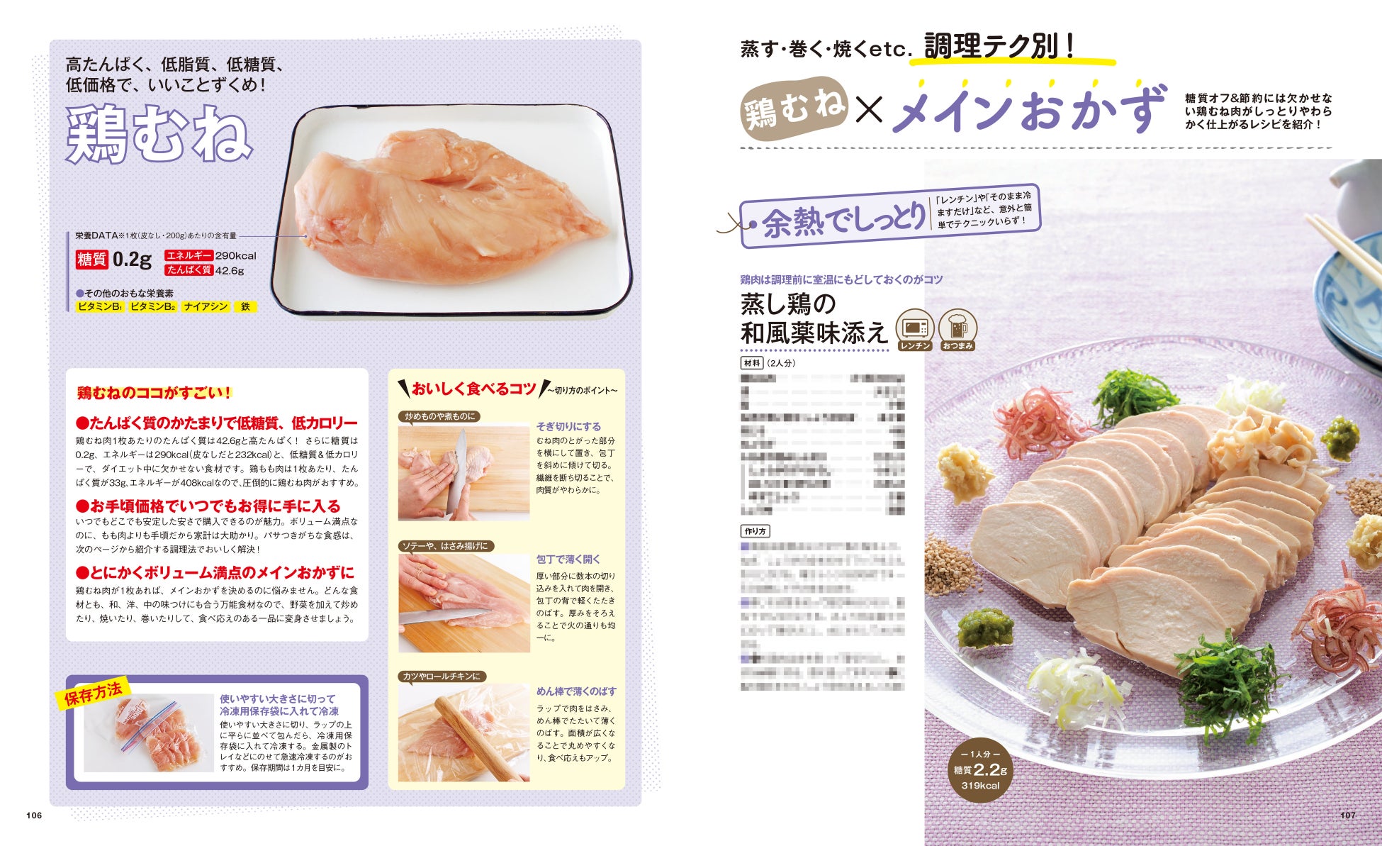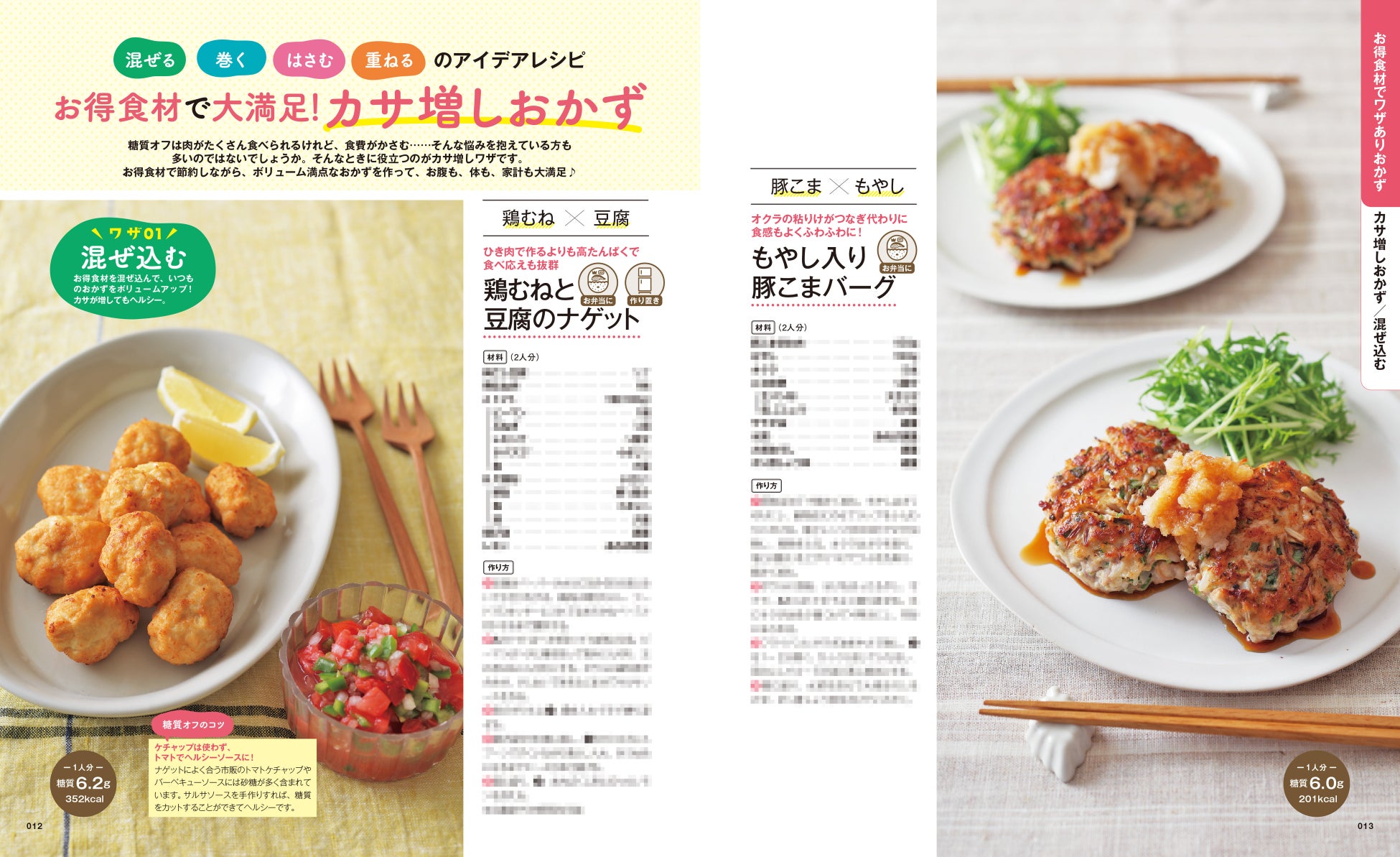 もやし、豆腐、卵、鶏むね、豚こまといった手に入りやすい5大お得食材を活用し、コスパよくボリュームたっぷりの料理を作る方法が満載。プロの料理家のみなさんがいろいろ工夫して作った糖質オフレシピを400品掲載しています。