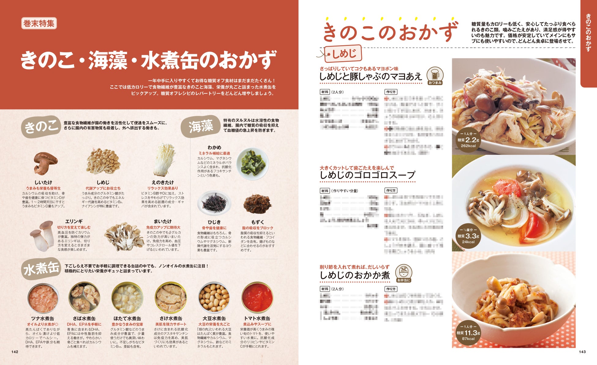 巻末特集では、糖質オフをより効果的にするための「きのこ・海藻・水煮缶」を使ったレシピも掲載しています。きのこと海藻は低カロリーでありながら、食物繊維が豊富で、腸内環境を整えるのにも役立ちます。