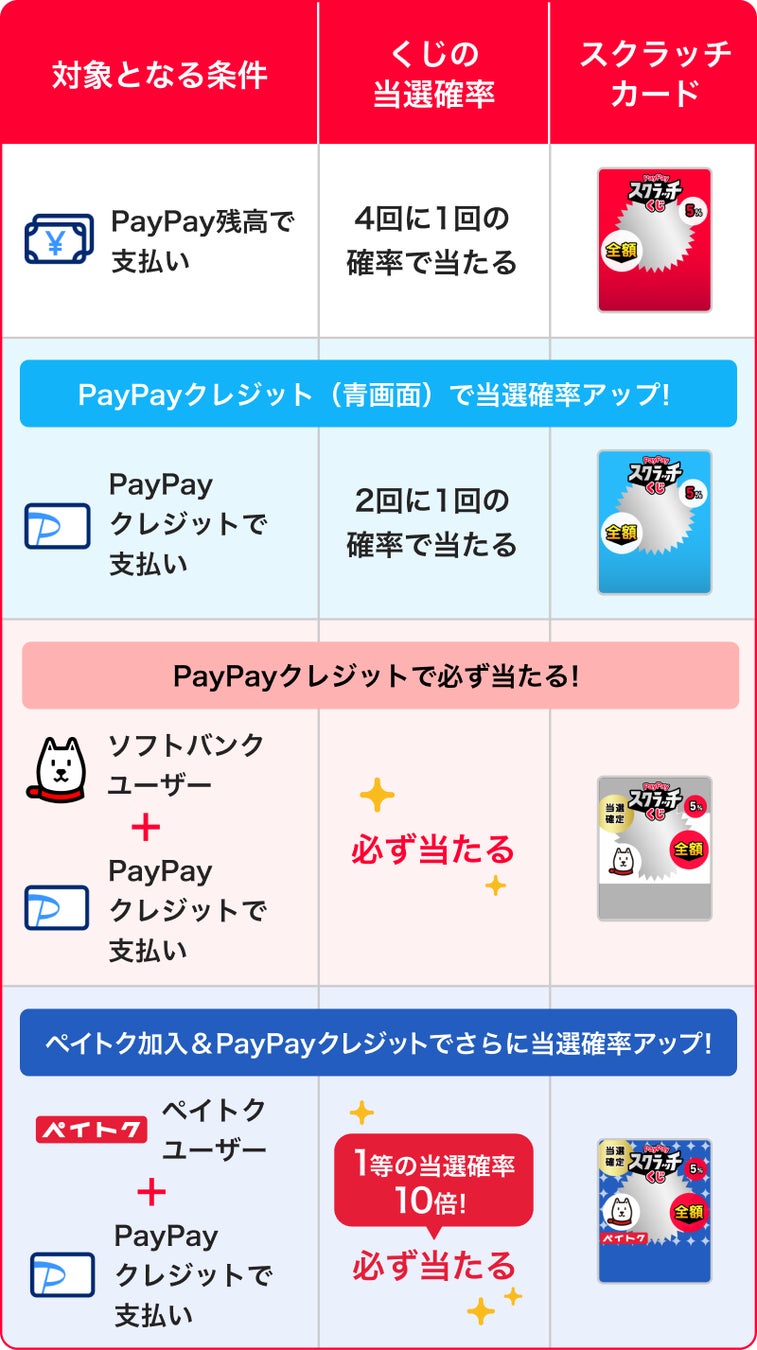 “ソフトバンク”のお客さまは、「PayPayクレジット」で決済すると「PayPayスクラッチくじ」の1等から3等までのいずれかが必ず当選し(※4)、“ソフトバンク”の「ペイトク」に加入しているお客さまが「PayPayクレジット」で決済すると、1等に当選する確率が10倍にアップします(※5)。詳細はこちらをご覧ください。