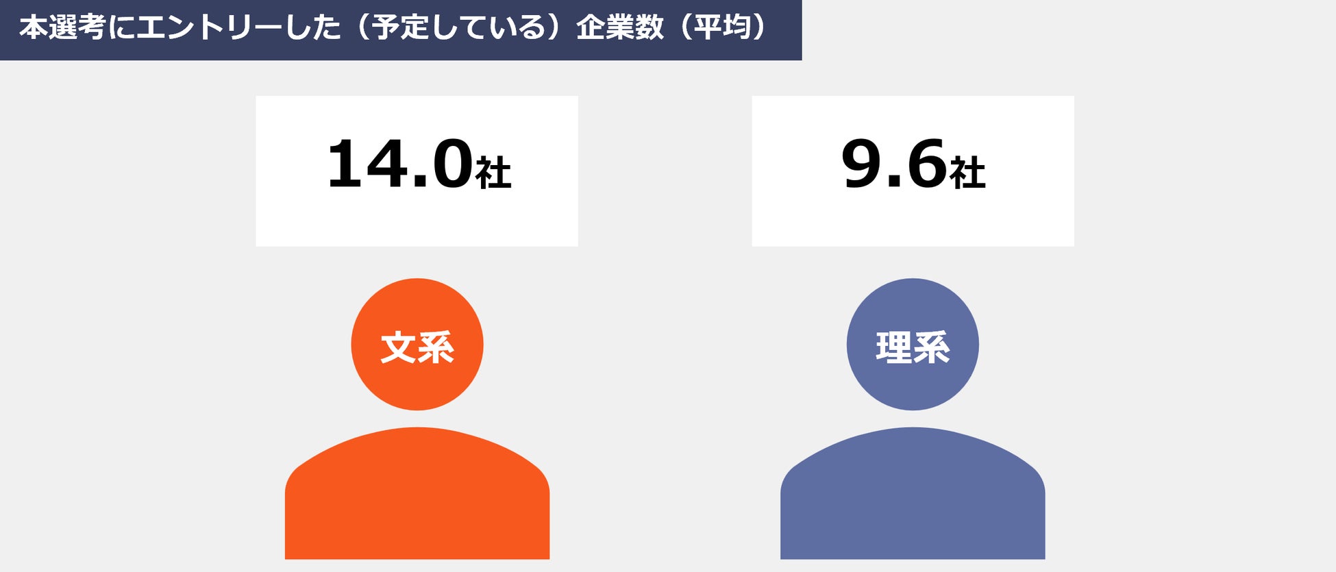 本選考に参加予定の企業数、平均は文系「14.0社」、理系「9.6社」。志望業界のトップは文理ともに「メーカー」で、理系学生の6割が希望。―『iroots』ユーザーアンケート―