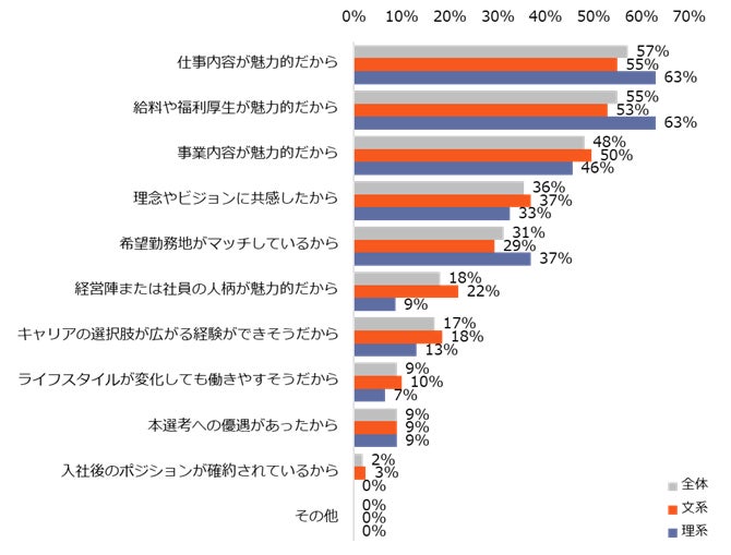 文系と理系で最もポイントに開きがあったのは「経営陣または社員の人柄が魅力的だから」で、文系が13ポイント高い結果になりました。(文系:22%、理系:9%)。