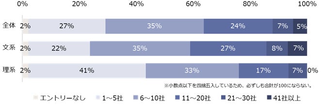 2026年3月に卒業予定の大学生・大学院生に、本選考にエントリーした(予定している)企業数を伺うと、文系の平均は「14.0社」、理系は「9.6社」でした。回答のボリュームゾーンは、文系学生は「6~10社」(35%)でしたが、理系学生は「1~5社」(41%)と、理系学生はより厳選傾向にあることが分かりました。