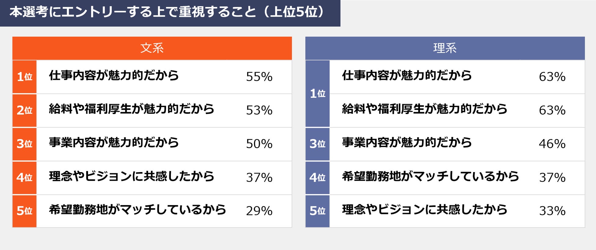 本選考にエントリーする上で重視することを伺うと、文系理系ともに「仕事内容が魅力的だから」がトップでした(文系:55%、理系:63%)。(理系は「給料や福利厚生が魅力的だから」も同率でトップ)。