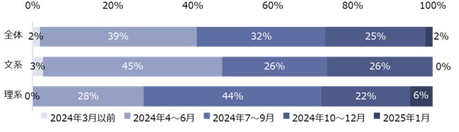 既に内定承諾をした方に、内定承諾先の企業と初めて接点を持った時期を伺うと、文系は「2024年4~6月」(45%)、理系は「2024年7~9月」(44%)が最多でした。