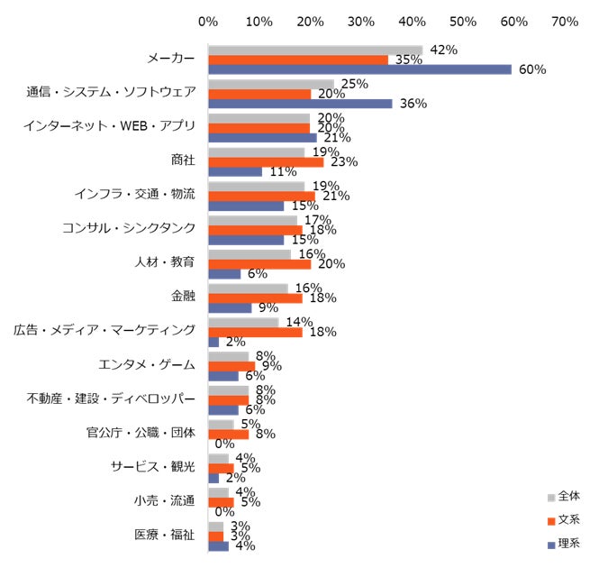 現在の志望業界を伺うと、トップは「メーカー」(42%)でした。文系理系いずれも第1位は「メーカー」(文系:35%、理系:60%)でしたが、第2位は、文系「商社」(23%)、理系「通信・システム・ソフトウェア」(36%)という結果で、順位に差が見られました。