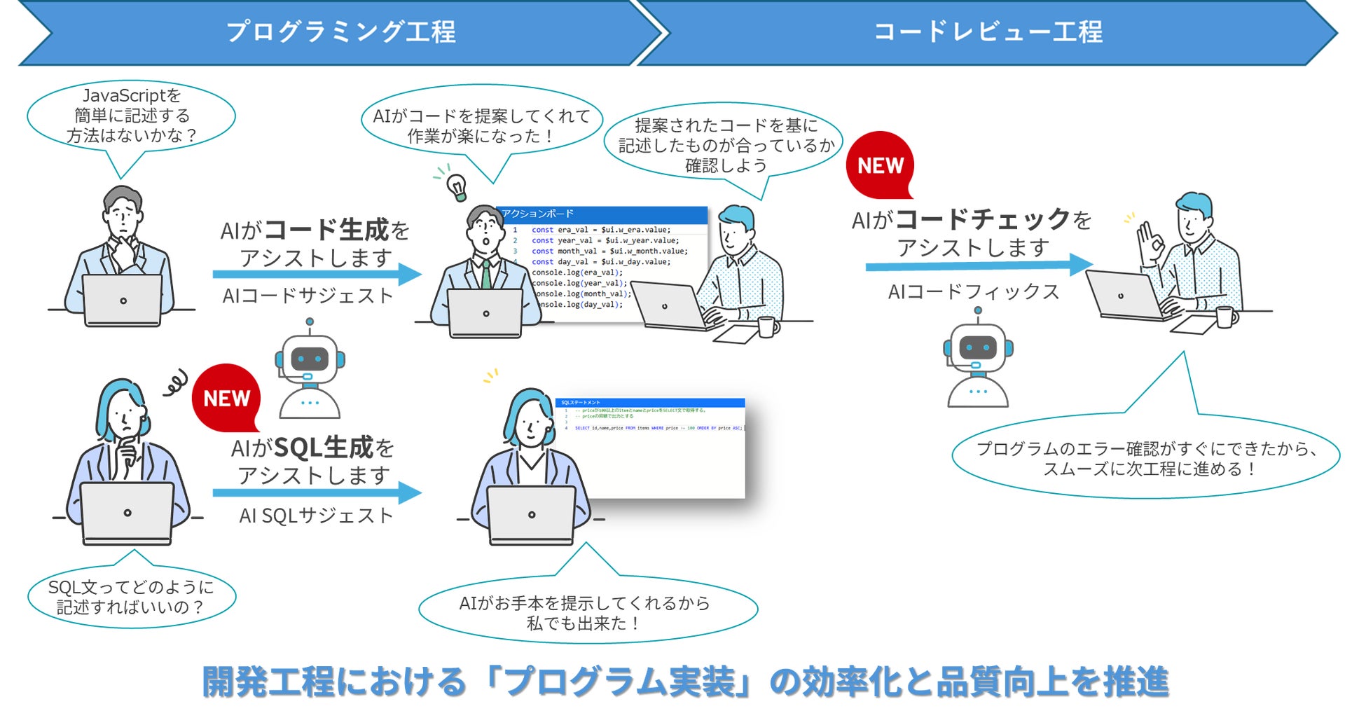今回、新たに生成AIを活用したSQL提案と構文チェックの機能を搭載し、デジタルサービス構築の推進と開発効率のさらなる向上を実現します。今後も、システム開発全体の効率化だけでなく、運用面においてもAIを活用した機能を拡充し、業務推進者の利便性を高める機能を積極的に提供していきます。