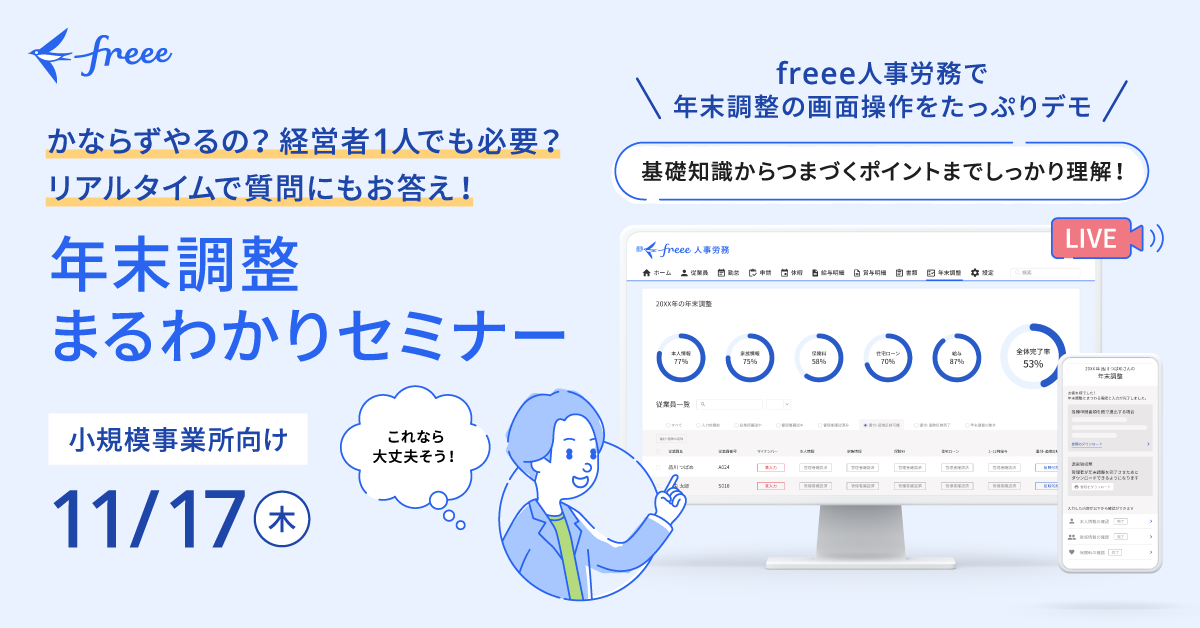 freee人事労務、小規模事業者向けに「年末調整まるわかりセミナー」を11月17日(木)12:00~オンライン無料開催