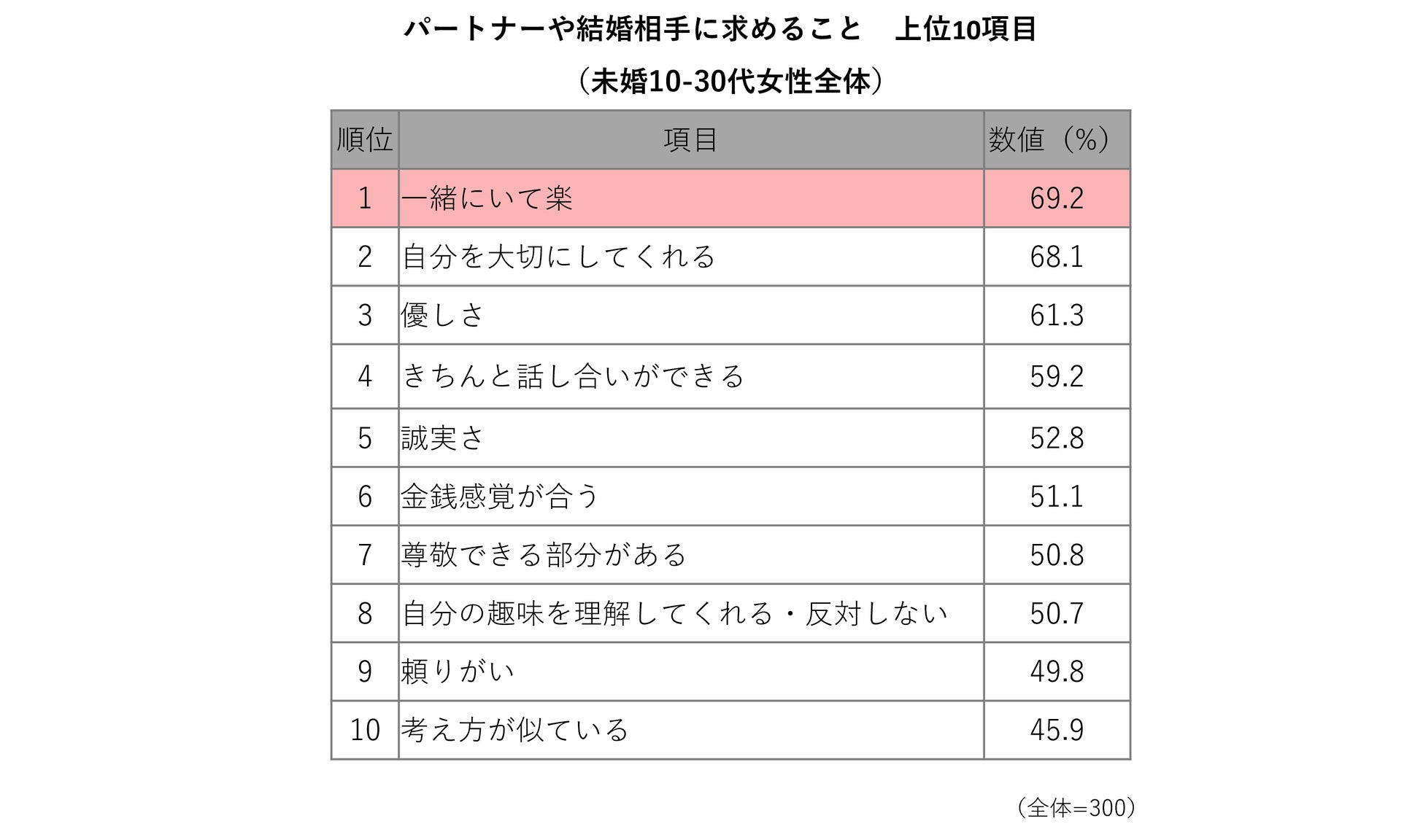 ・パートナーや結婚相手に求めることの上位10項目を見ると、「一緒にいて楽」が69.2%で最上位に。