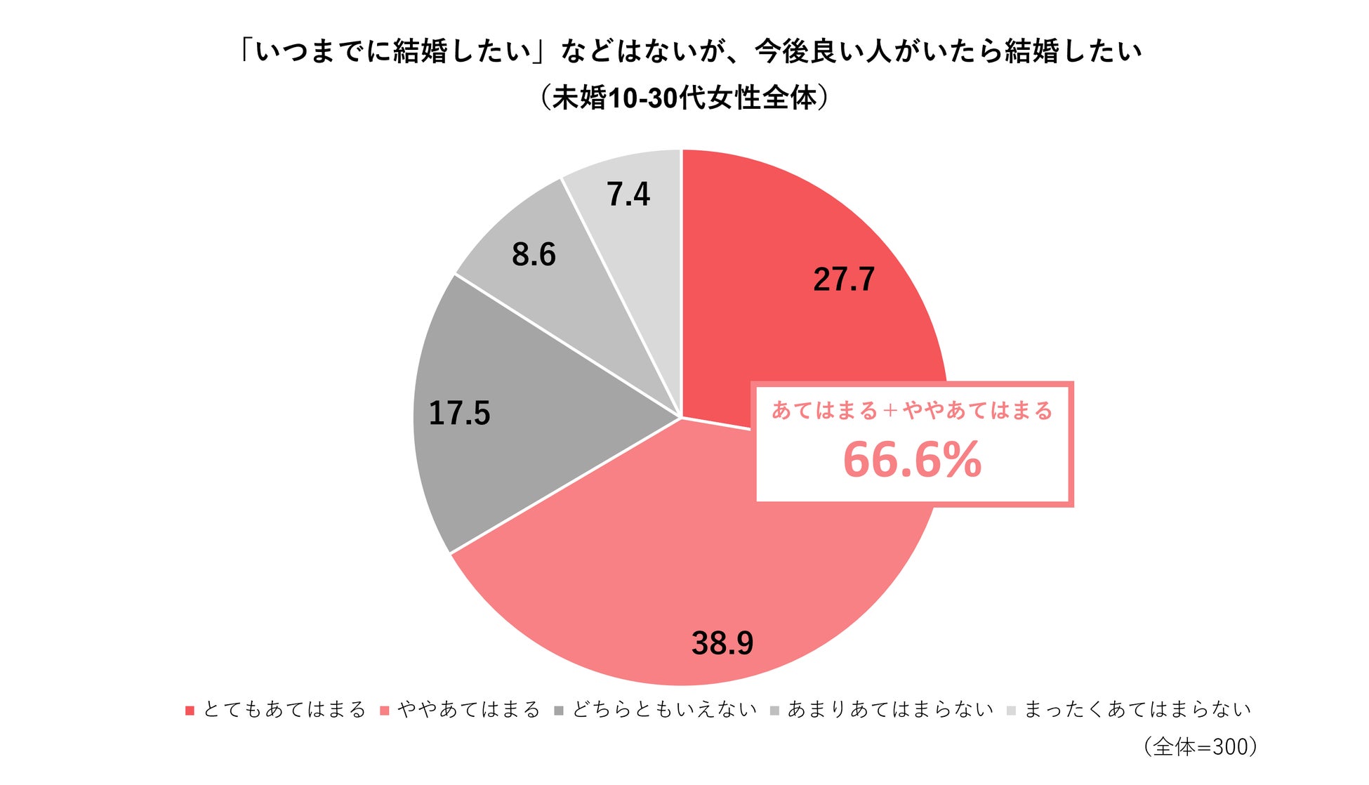 ・10-30代の未婚女性全体のうち66.5%が「いつまでに結婚したいなどはないが、いい人がいたら結婚したい」という気持ちがとても/やや当てはまると回答。