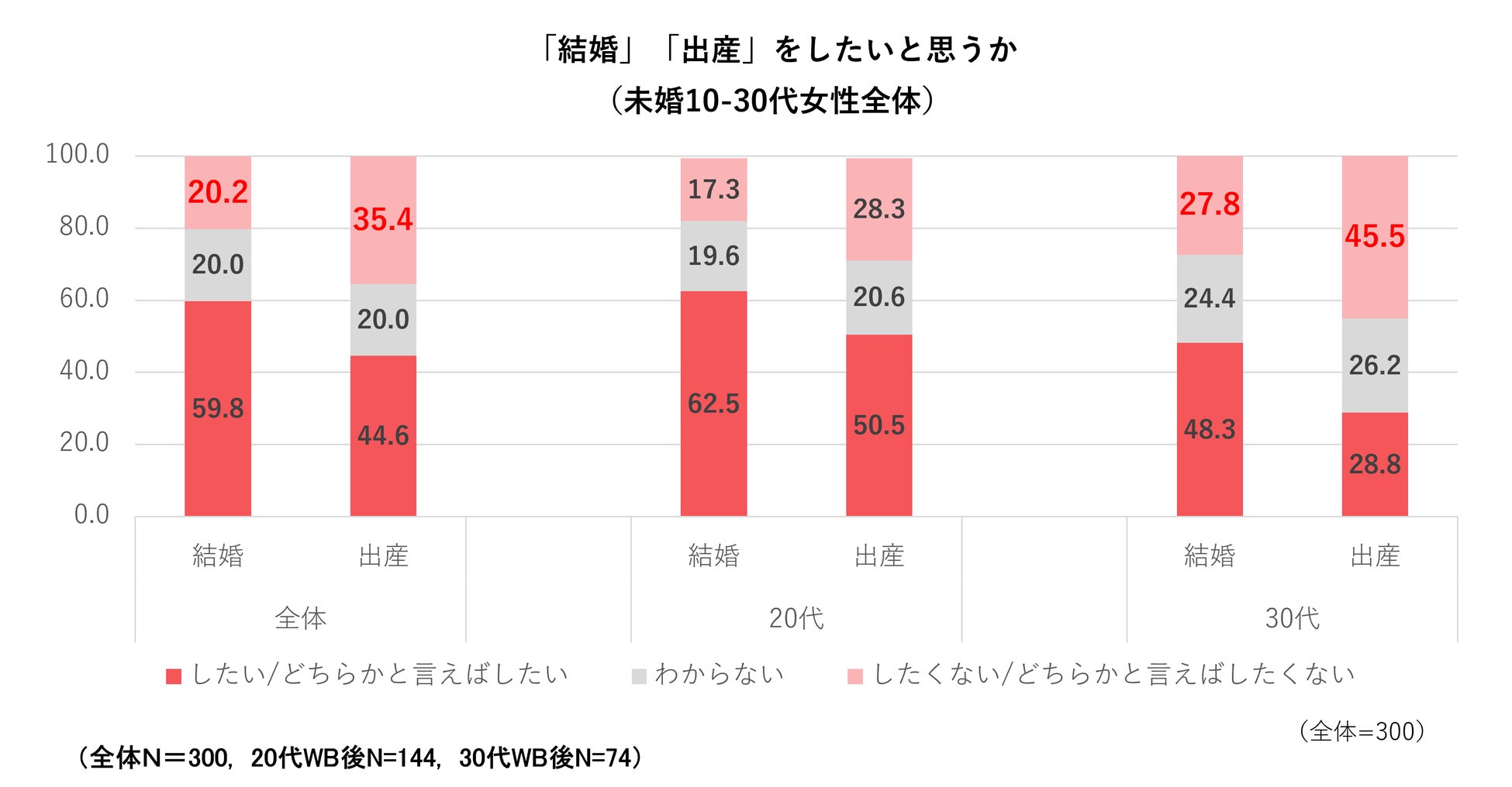 ・未婚女性のうち20.2%が、結婚はどちらかといえばしたくない/したくないと回答。35.4%が出産はどちらかといえばしたくない/したくないと回答