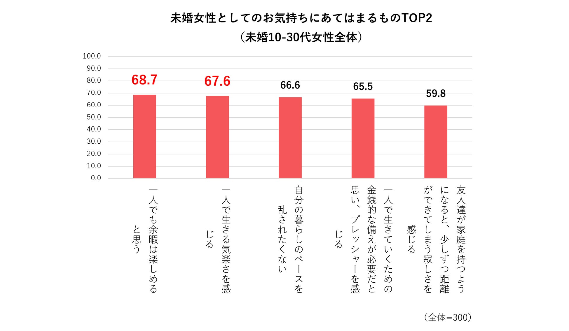 10-30代の未婚女性に対して、未婚女性としての気持ちで当てはまる項目を聞いたところ、数値の大きかったものとして68.7%が「一人でも余暇を楽しめる」、67.6%が「一人で生きる気楽さを感じる」と回答しており、未婚であることを前向きに捉える意識が目立ちました。