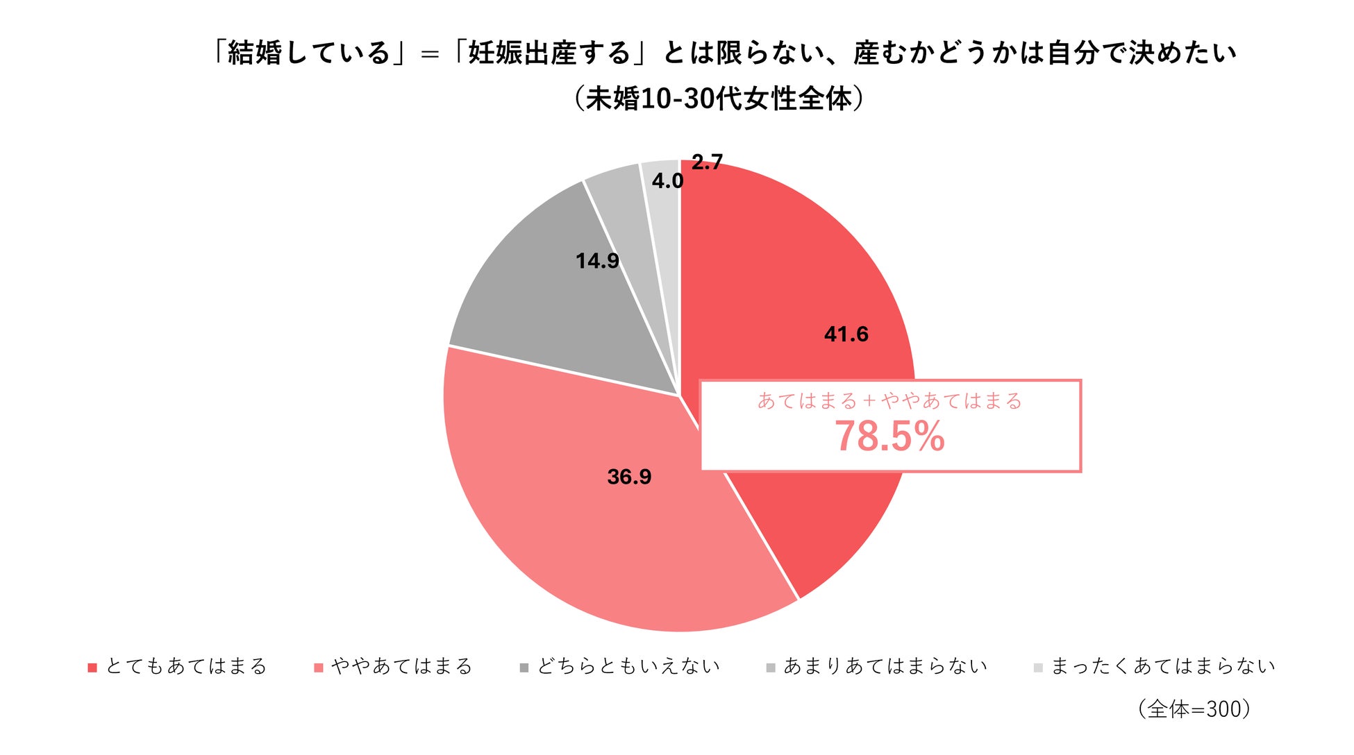 10-30代の未婚女性に対して将来の出産に対する意識・価値観を聞いたところ、78.5%が「結婚している=妊娠出産するとは限らない、産むかどうかは自分で決めたい」と回答しました。リプロダクティブ・ライツ(≒自分の身体に関する決定は自分でできる権利だとする考え)が見て取れるのと同時に、「自身のライフプランの決定権は自分にある」と思うのが、今の女性全体の傾向として見て取れます。