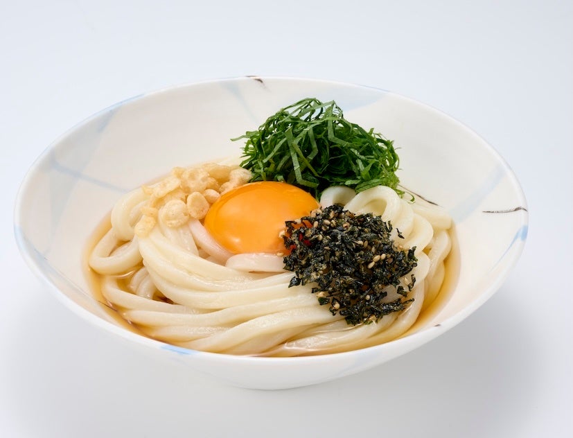「韓国風ごま油味わかめふりかけ」大さじ2杯 うどん1玉、卵1個、めんつゆ(2倍濃縮)大さじ4杯 (お好みで)大葉1枚/天かす適量