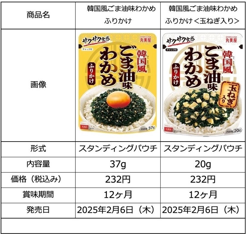 丸美屋食品工業株式会社(本社:東京都杉並区、社長:阿部豊太郎)は、サクサクの食感がクセになる「韓国風ごま油味わかめふりかけシリーズ」を2025年2月6日(木)に新発売いたします。