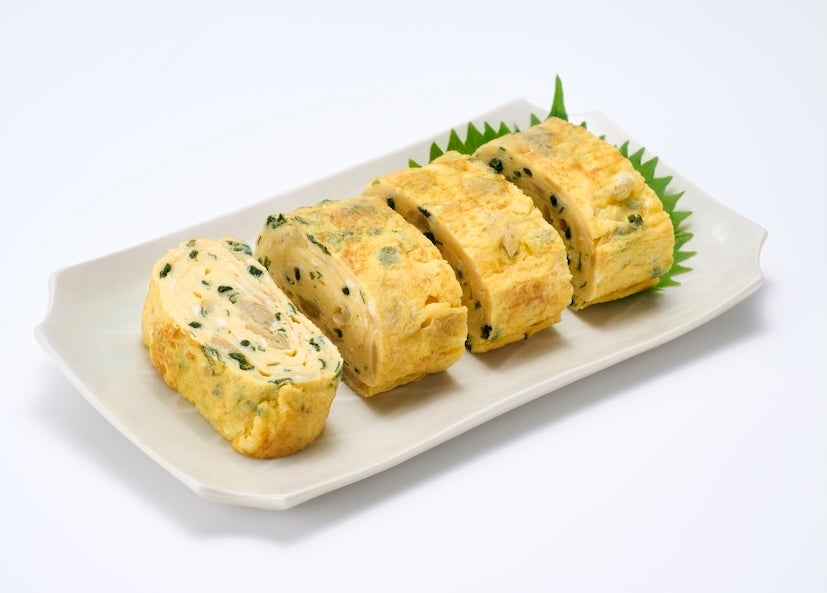 1. 卵焼き器(卵焼き用フライパン)に油をひいて熱し、卵液を少量流し入れ半熟状態になったら手前に巻きます。