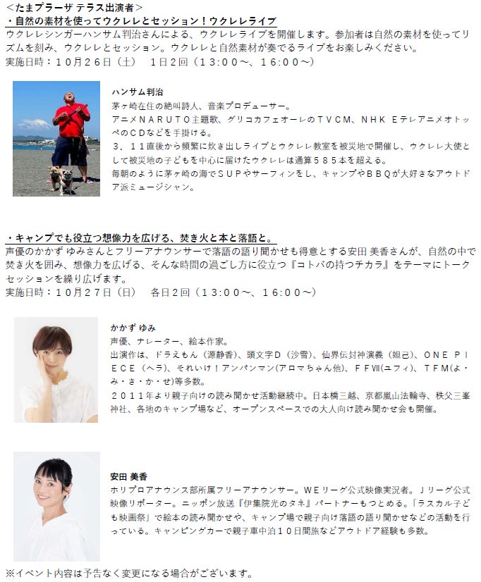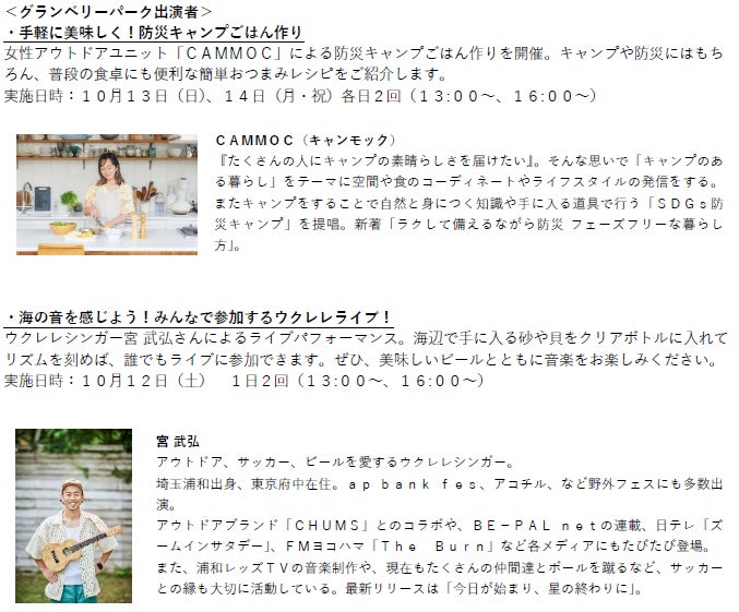 本イベントでは、テントや模擬たき火、キャンプチェアやランタンなどを設置したキャンプ空間を演出した会場で、ビールやキャンプフードを楽しむことができ、都会の駅近くでアウトドア気分を味わっていただけます。今年は開催時間を20時まで延長し、秋の夜空を眺め、DJ LIVEを楽しみながら美味しいビールをご堪能いただけます。さらに、人気のアウトドアクッキングコーディネーター CAMMOCによる、アウトドアにちなんだトークショーも開催します。