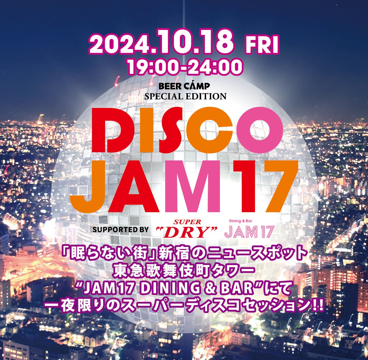 その他にも、東急歌舞伎町タワー17階のJAM17 DINING & BARでは、キャンプの雰囲気とは一転、DISCOとホテル自慢の料理を楽しみながら、アサヒスーパードライを美味しく飲めるSPECIAL EDITION「 DISCO JAM17」を開催します。
