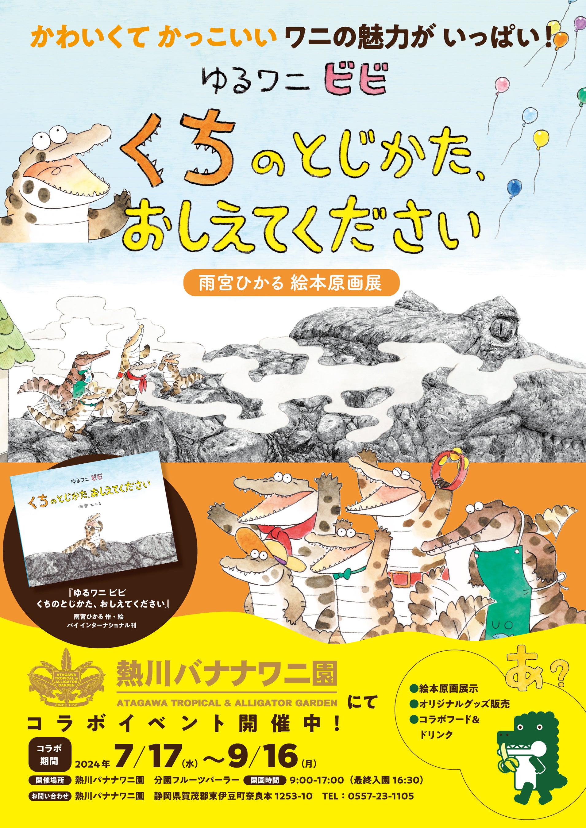 7月17日(水)から9月16日(月)にかけて、熱川バナナワニ園で絵本原画展を開催いたします。同時にオリジナルグッズの販売や、園内のカフェにてコラボフード&ドリンクの提供もございます。夏休みのお出かけに、ぜひ足をお運びください。