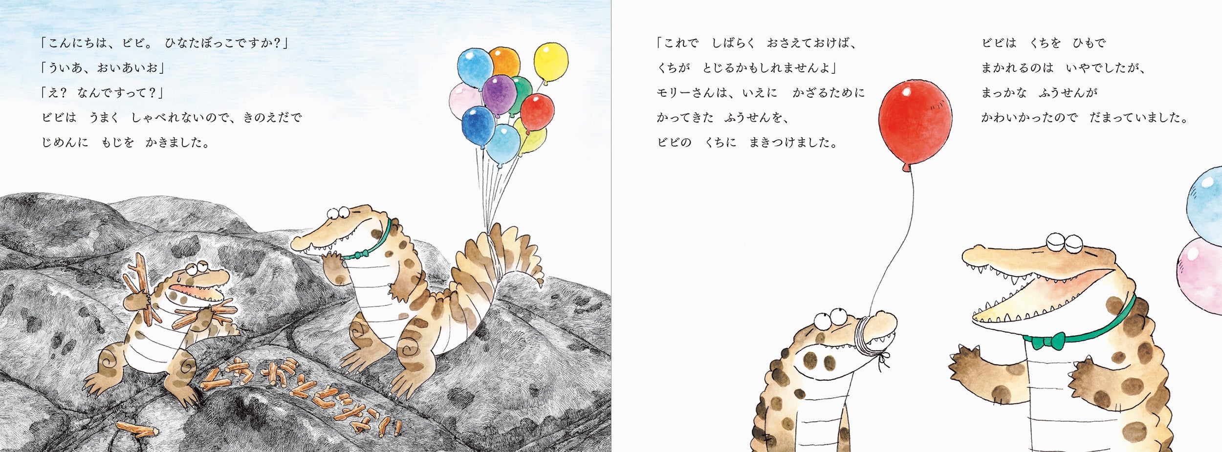大きなあくびをしたワニのビビ。意識した途端、口の閉じ方がわからなくなりました。友達が助けようとしてくれますが、何をしてもぱかっと開いてしまいます。かわいらしいキャラクターと繊細なタッチの絵が融合した、ワニの魅力がつまった絵本。
