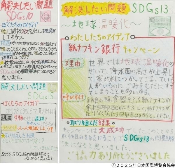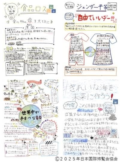 「SDGsキッズポスター展」では、2025年日本国際博覧会協会が実施する教育プログラムに参加する小学校の子どもたちが、 プログラムを通して学んだ成果として“すべての”いのち輝くためのアイデアを考え、作成したアイデアポスターを展示します。