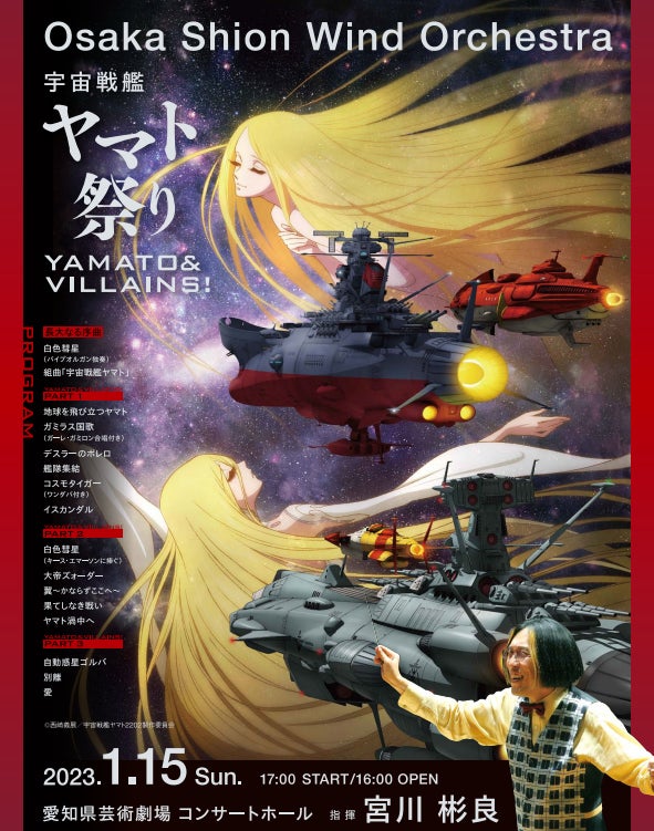 メ~テレ(名古屋テレビ放送)では、日本を代表する吹奏楽団「Osaka Shion Wind Orchestra」と宮川彬良による、「宇宙戦艦ヤマト」の名曲の数々を披露するという、吹奏楽ファンにとっても、アニメファンにとっても魅力あふれるコンサートを2023年1月15日(日)、愛知県芸術劇場 コンサートホールで開催します。