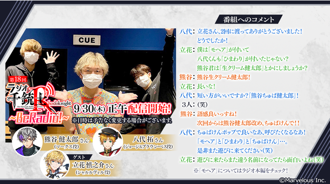 株式会社マーベラス(代表取締役社長 許田周一/所在地:東京都品川区)は、『千銃士』プロジェクトの完全新作スマートフォンゲーム『千銃士:Rhodoknight』(読み:せんじゅうし ろーどないと 以降、『千銃士R』)にて、立花慎之介さんをゲストに迎え、熊谷健太郎さん、八代拓さんによるラジオ番組、第18回「千銃士R~BeRadio!~」を本日配信開始いたしました。また、配信を記念して熊谷健太郎さん(マークス役)、八代拓さん(ジョージ&ブラウン・ベス役)、立花慎之介さん(シャルルヴィル役)の直筆寄せ書きサイン色が当たるリツイートキャンペーンを開始いたしました。