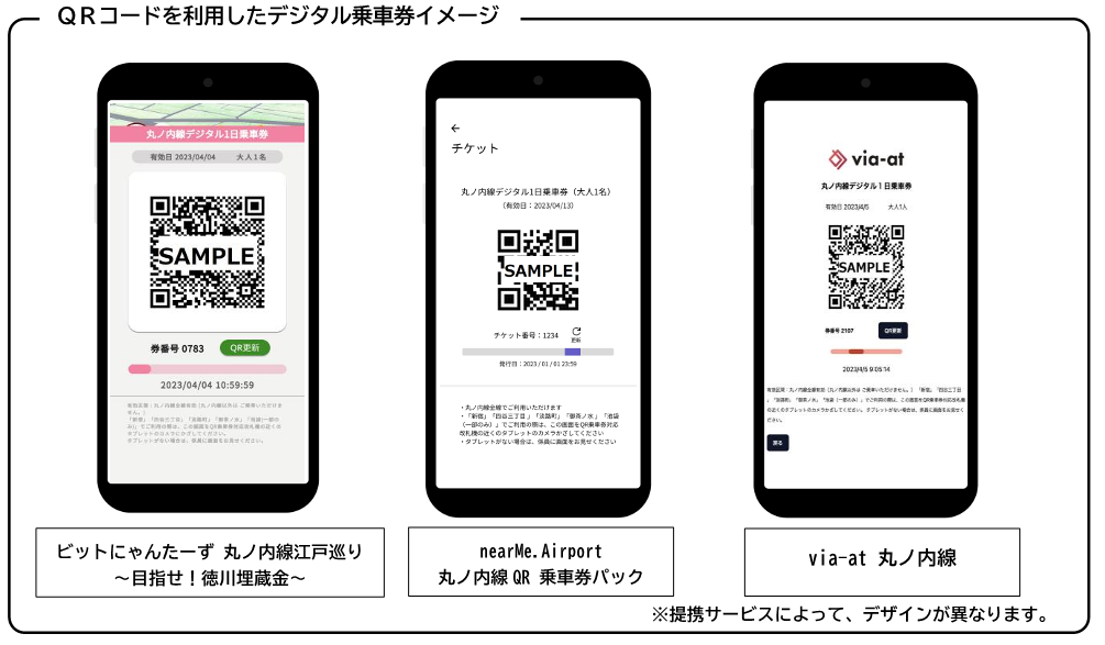 丸ノ内線デジタル1日乗車券とサービス提携会社のサービス(以下、「提携サービス」といいます。)のセットを、QRコード乗車券として一般のお客様に期間限定で発売し、QRコードを利用した乗車サービスの実証実験を実施します。