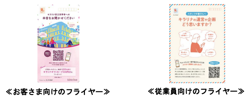 お客さまには、キラリナ京王吉祥寺の施設内各所に掲出するもしくは店頭で配布するフライヤー・ポスターの二次元バーコードから「ホンネPOST」の投稿画面にアクセスしていただき、キラリナ京王吉祥寺について感じていることや気付いたこと、ご要望などを投稿していただきます。投稿内容を元に「定性指標の効果測定」「これまで取り切れなかったキラリナ京王吉祥寺におけるニーズの発掘」を実施します。