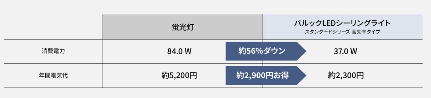 ※1:当社2010年発売100形ツインパルック蛍光灯器具(HHFZ4340)と2021年発売LEDシーリングライト(HH-CG1234A)との比較を参考として表記。100形ツインパルック蛍光灯器具(HHFZ4340)は生産完了。電気料金は、1日5.5時間、年間2,000時間使用。電力量目安単価31円/kWh(税込)[2022年7月改訂]で計算。当社調べ。使用条件により変わることがあります。