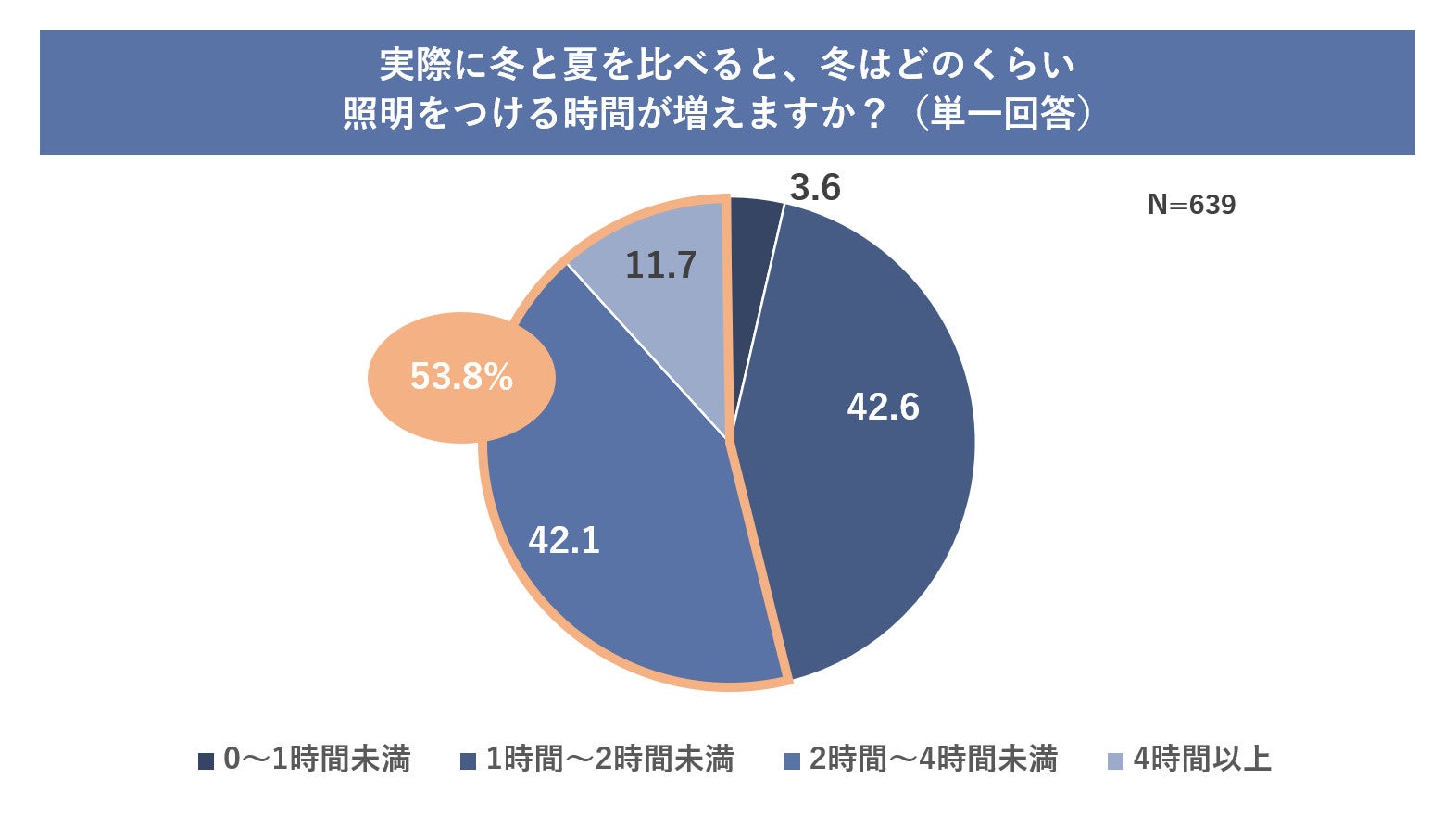 ・冬は部屋の照明器具をつける時間が夏と比べて増えると回答した人は8割に。その中でも半数以上の人が2時間以上長く照明器具を長くつけていることが判明。日照時間が短い冬はどうしても点灯時間が長くなってしまう傾向。