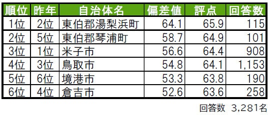 1位は2年連続で東伯郡琴浦町で、「街の幸福度」「街に愛着がある」2位など、各ランキングで上位に入っています。2位も2年連続で米子市で、「住みここち」1位、「街の幸福度」3位など全てのランキングで高評価を得ています。3位は西伯郡大山町で、「街に誇りがある」「街に愛着がある」1位の街です。大山町は、昨年は累計回答数が50名未満でランキング集計対象外でした。