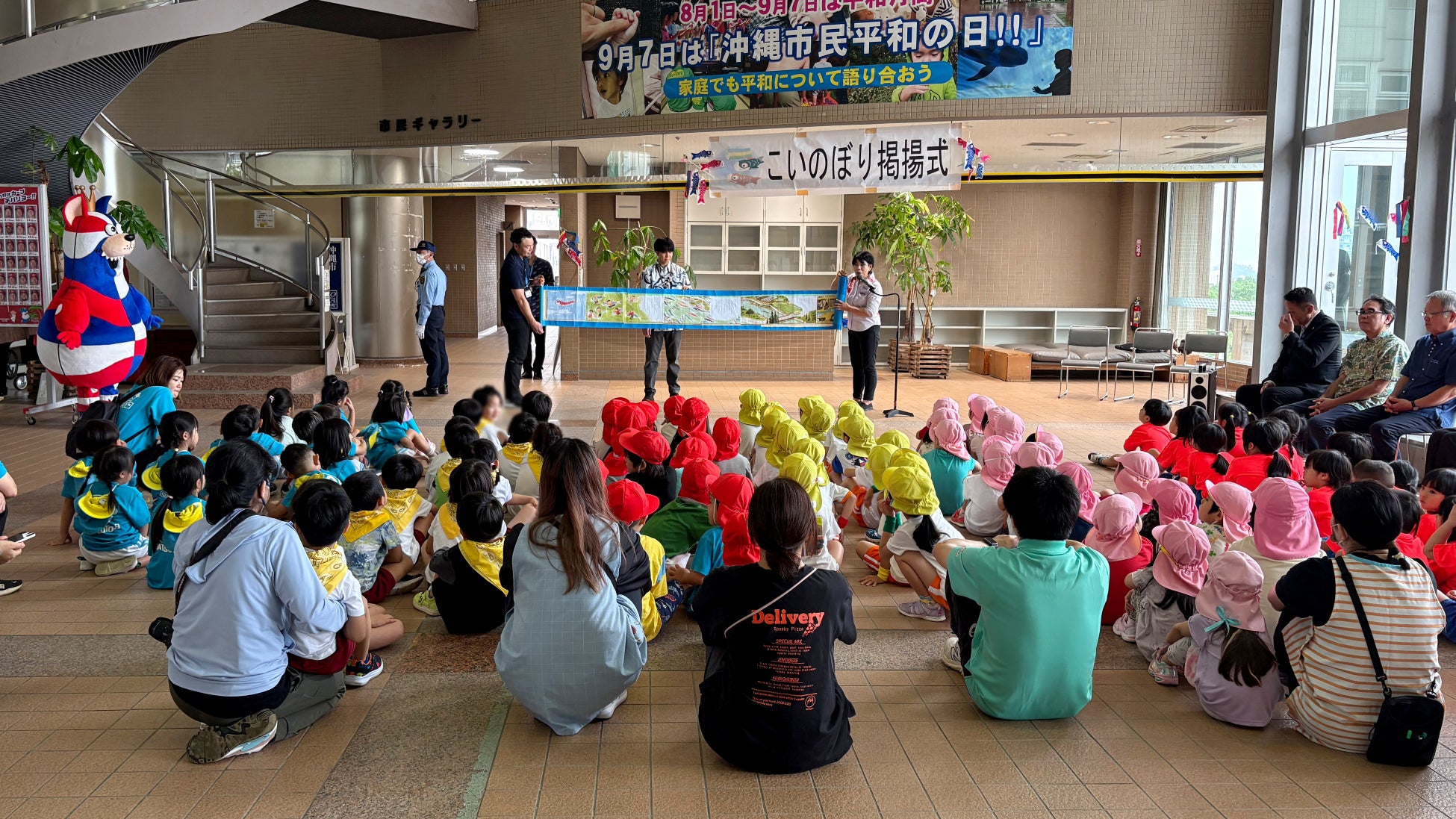 当日はあいにくの雨模様となり、沖縄市役所の玄関ロビーでの開催となりましたが、花城市長はじめ多くの来賓の方々と市内の保育園6園から園児たちが参加しました。鯉のぼりについての紙芝居や、各園の園児たちによるパフォーマンスが披露され、会場は和やかな雰囲気になりました。ゴーディーの登場に園児たちは大喜びで、一緒に「こいのぼり」の歌を歌ったり、記念撮影を行ったりと、子どもたちとの交流を楽しみました。