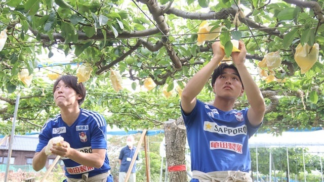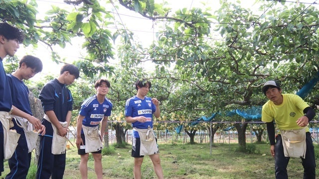 6月18日(火)、今シーズンよりプロサッカー選手としてのキャリアを歩み始めた奥村仁選手と石山青空選手(負傷した森璃太選手は欠席)が、新潟市南区にある白根グレープガーデンを訪問し、新潟県立白根高等学校の生徒と一緒に、ル レクチエの栽培体験を行いました。2回目となる今回の活動には、強化部の本間勲スカウトも同行していました。