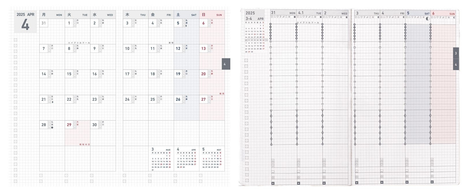 月の予定を一覧できる「月間ブロック」ページと24時間軸を採用した「週間バーチカル」ページ。TODOリストやメモが書き込める、情報整理に役立つスペースも備わっています。