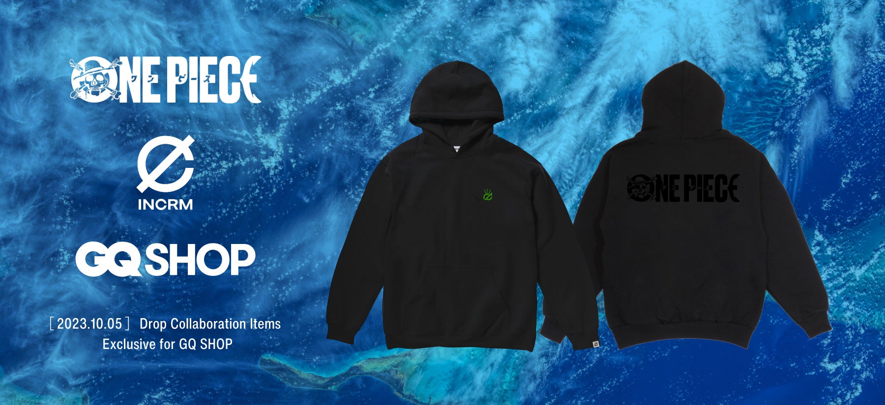 「GQ SHOP」と、Netflix オリジナル実写ドラマシリーズ「ONE PIECE」でゾロ役を演じた俳優の新田真剣佑がプロデュースするファッションブランドINCRM(インクリム)、「ONE PIECE」がタッグを組んだトリプルコラボが実現!麦わらの一味の主要キャラクターであるルフィ、ゾロ、ナミ、ウソップ、サンジの5人の公式カラーでコラボロゴを彩ったデザインのパーカー5種がラインナップする。2023年10月5日(木)から一般先行予約開始。