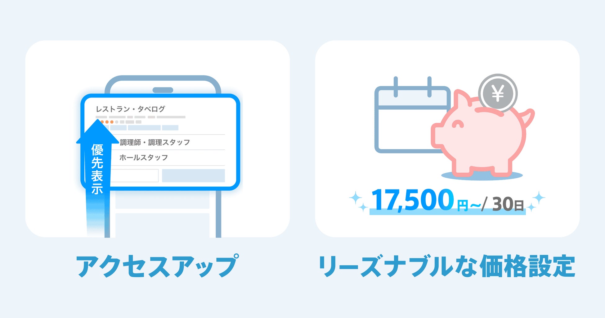 本サービスは、求人への応募数を増やしたい飲食店向けに、求人情報の検索結果での上位表示機能を提供することで、求職者への露出を高め、より効率的な人材採用を支援します。