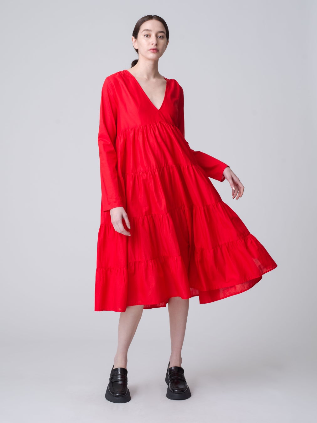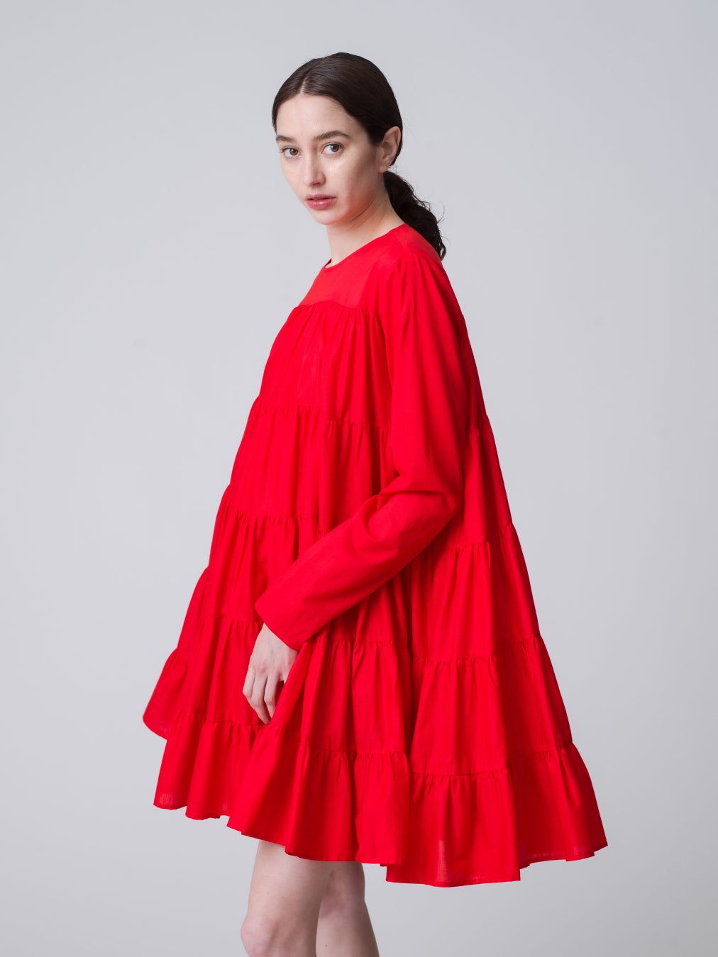 Merletteのファーストコレクションで発表されて以来、世界中で愛されているベストセラーアイテム。すっきりとしたヨークからボリュームたっぷりのティアードが裾まで広がるデザインで、身体が美しく見える丈感やバランスが人気です。マニッシュなシューズを合わせて一枚で着るのはもちろん、デニムと合わせてチュニックとしても着方のアレンジが可能です。