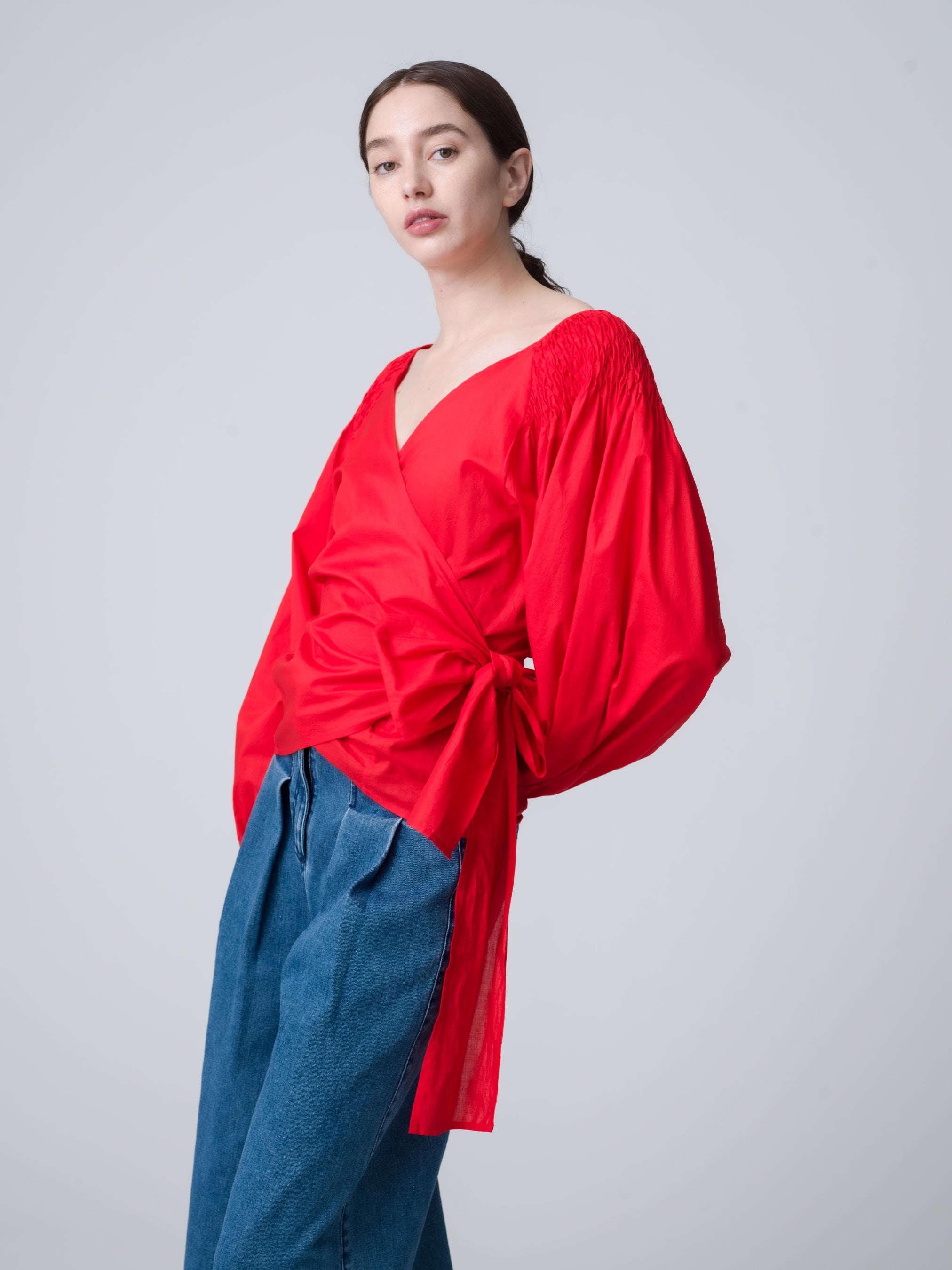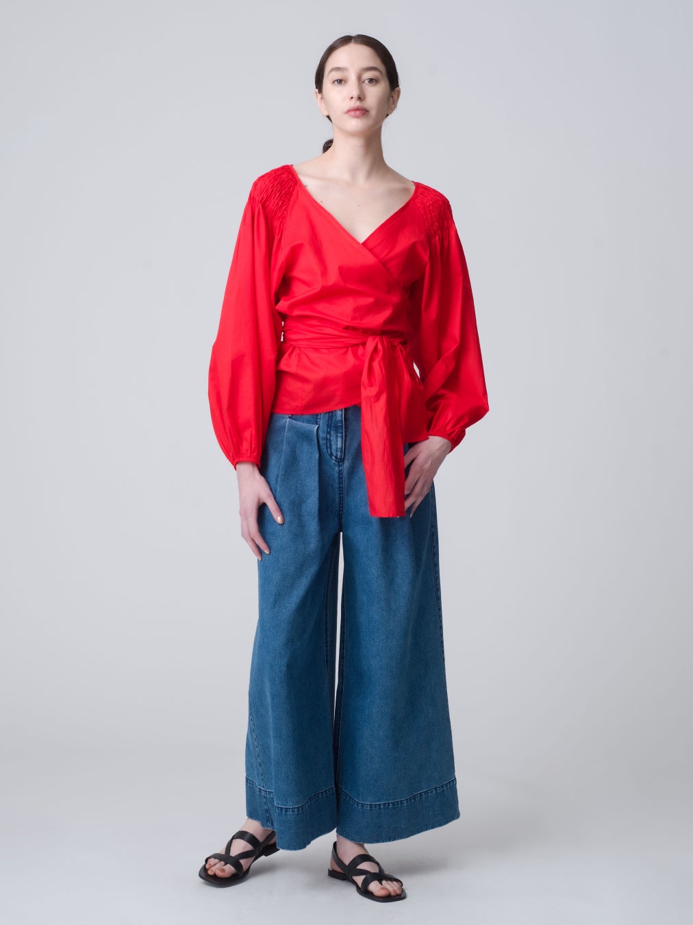 ファーストコレクションで登場した際に日本でとても人気が高かったカシュクールブラウスは、さらりとデニムに合わせたいデイリーユースな一枚。コロンとした袖のボリューム感が可愛らしく、鮮やかなポピーカラーが清々しい気分にさせてくれます。長らくコレクションに登場していなかったので何度もラブコールを送り、今回特別に復刻していただきました。