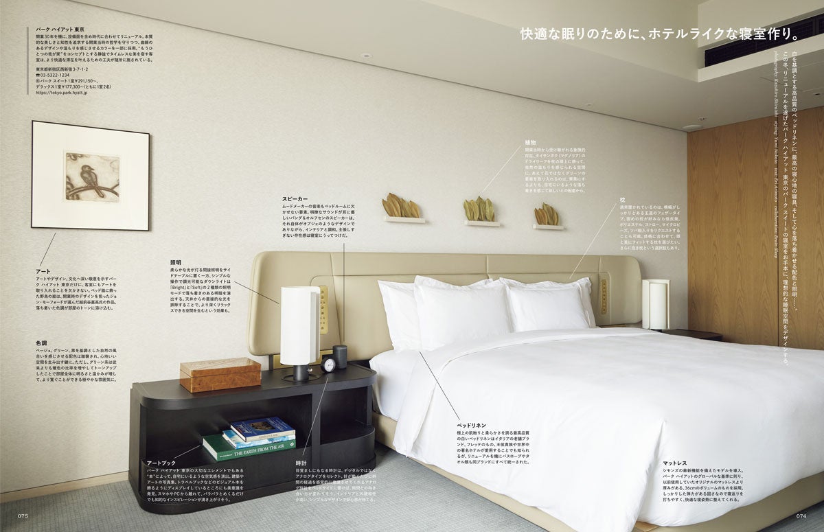 白を基調とする高品質のベッドリネンに、最高の寝心地の寝具、そして心を落ち着かせる配色と照明……。この冬、リニューアルを遂げたパーク ハイアット 東京のパーク スイートの寝室をお手本に、理想的な睡眠空間をデザインする。
