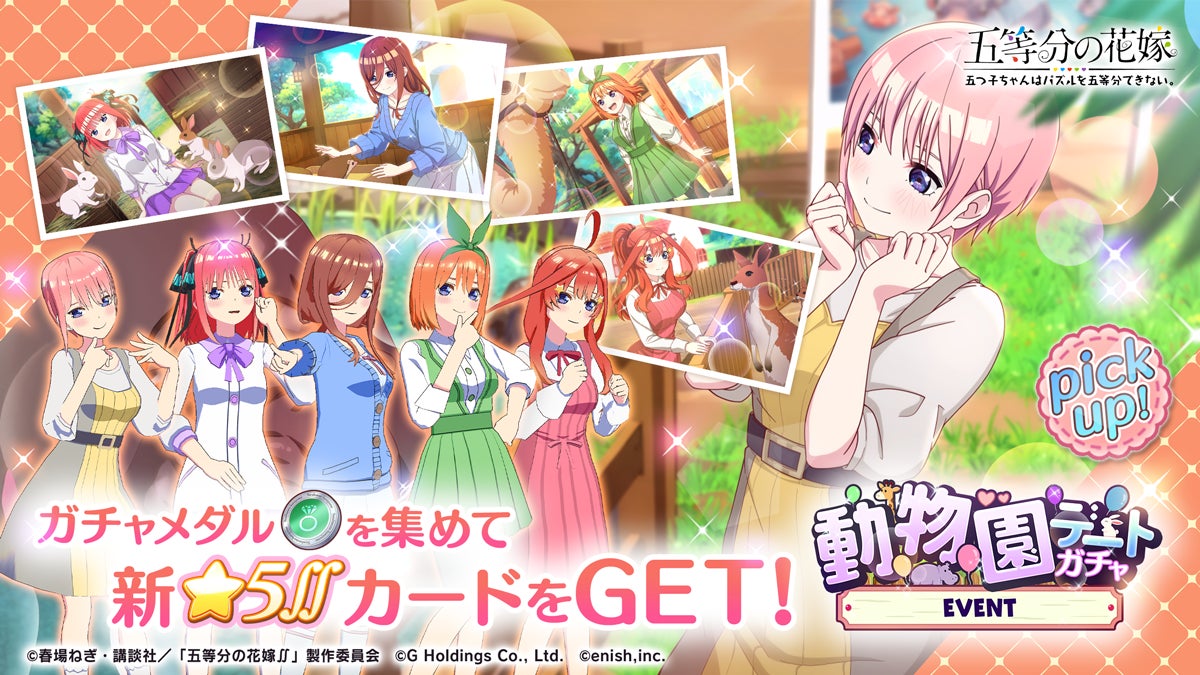 新イベント「五つ子ちゃんと誕生日デート!~特別なディナーをゲットしろ!~」に先駆けて、「動物園デート」をテーマにしたガチャが期間限定で開催いたします。