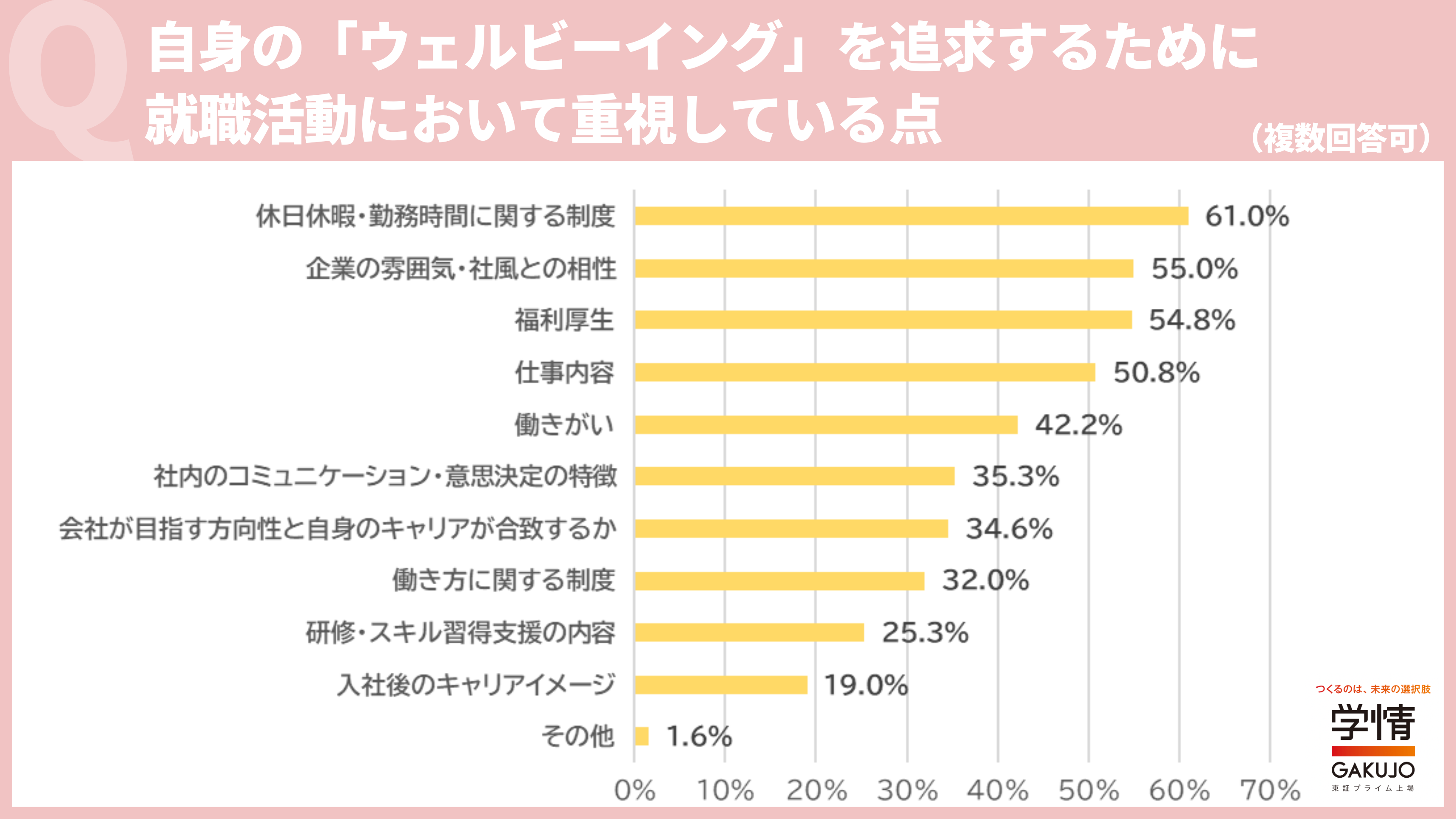 自身の「ウェルビーイング」を追求するために、就職活動において重視している点は、「休日休暇・勤務時間に関する制度」が61.0%で最多。次いで、「企業の雰囲気・社風との相性」55.0%、「福利厚生」54.8%、「仕事内容」50.8%が続きました。「人間関係はストレスの大きな原因になるので、職場の雰囲気が自身と合っているかは大切だと思う」「やりがいを感じられるか、自身が会社や社会に貢献できていると感じられるかは仕事の充実感にも関わってくると思う」「仕事とプライベートを両立できる働き方をしたい」といった声が上がりました。