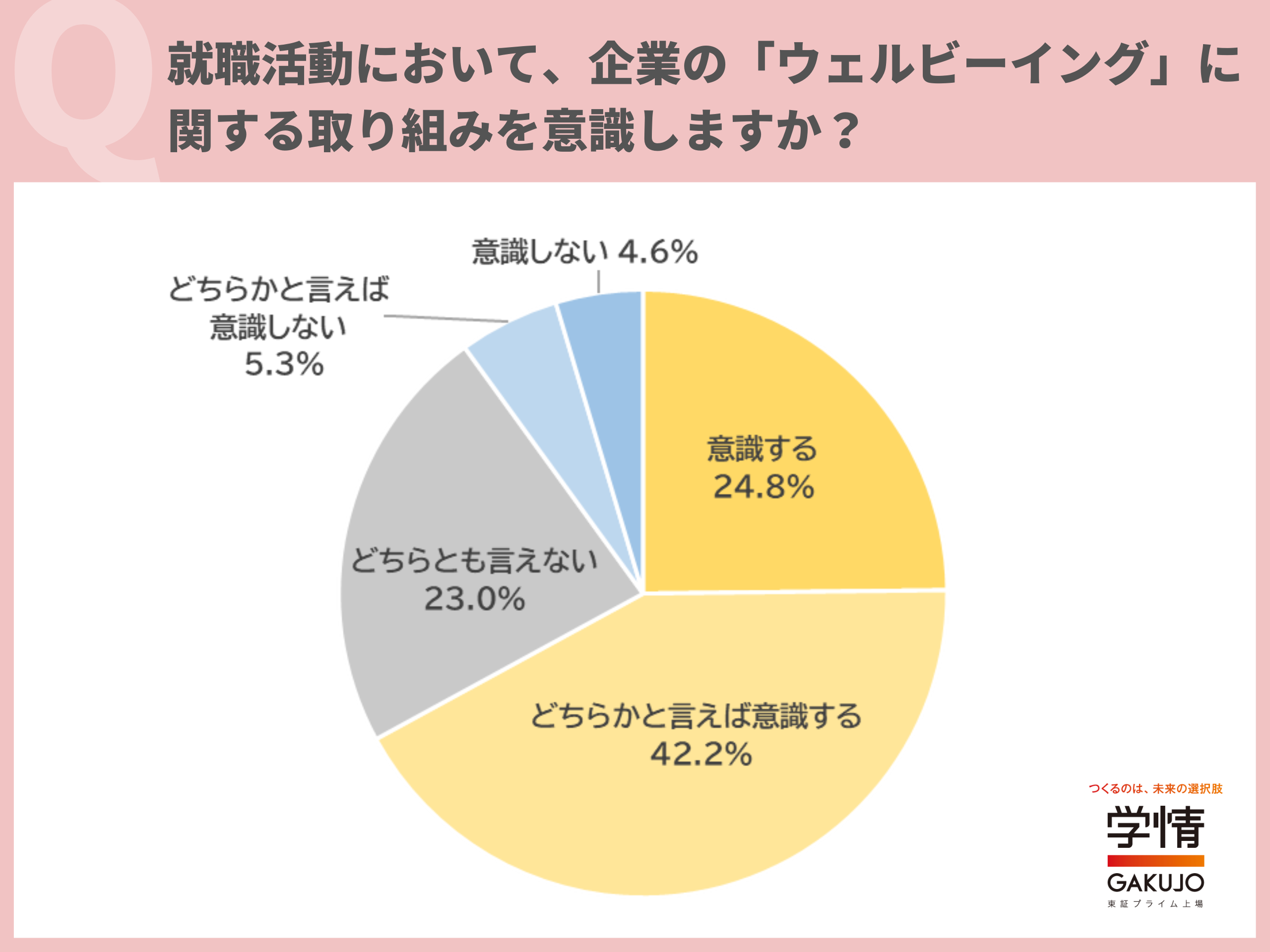 就職活動において、企業の「ウェルビーイング」に関する取り組みを「意識する」「どちらかと言えば意識する」と回答した学生が7割に迫りました。「心身共に健康であることが、仕事のパフォーマンスや生産性にも影響すると思う」「社員がやりがいや幸福を感じながら働ける企業は、柔軟な発想や活発な議論が可能だと思う。企業としての成長力も高いと感じる」といった声が上がっています。健康的な働き方をすることで、仕事のパフォーマンスを高めたいという意向がうかがえます。