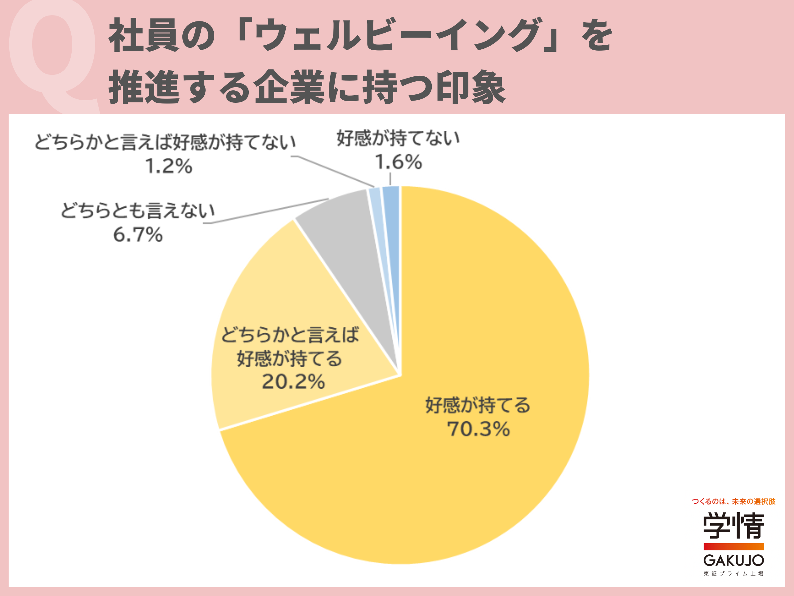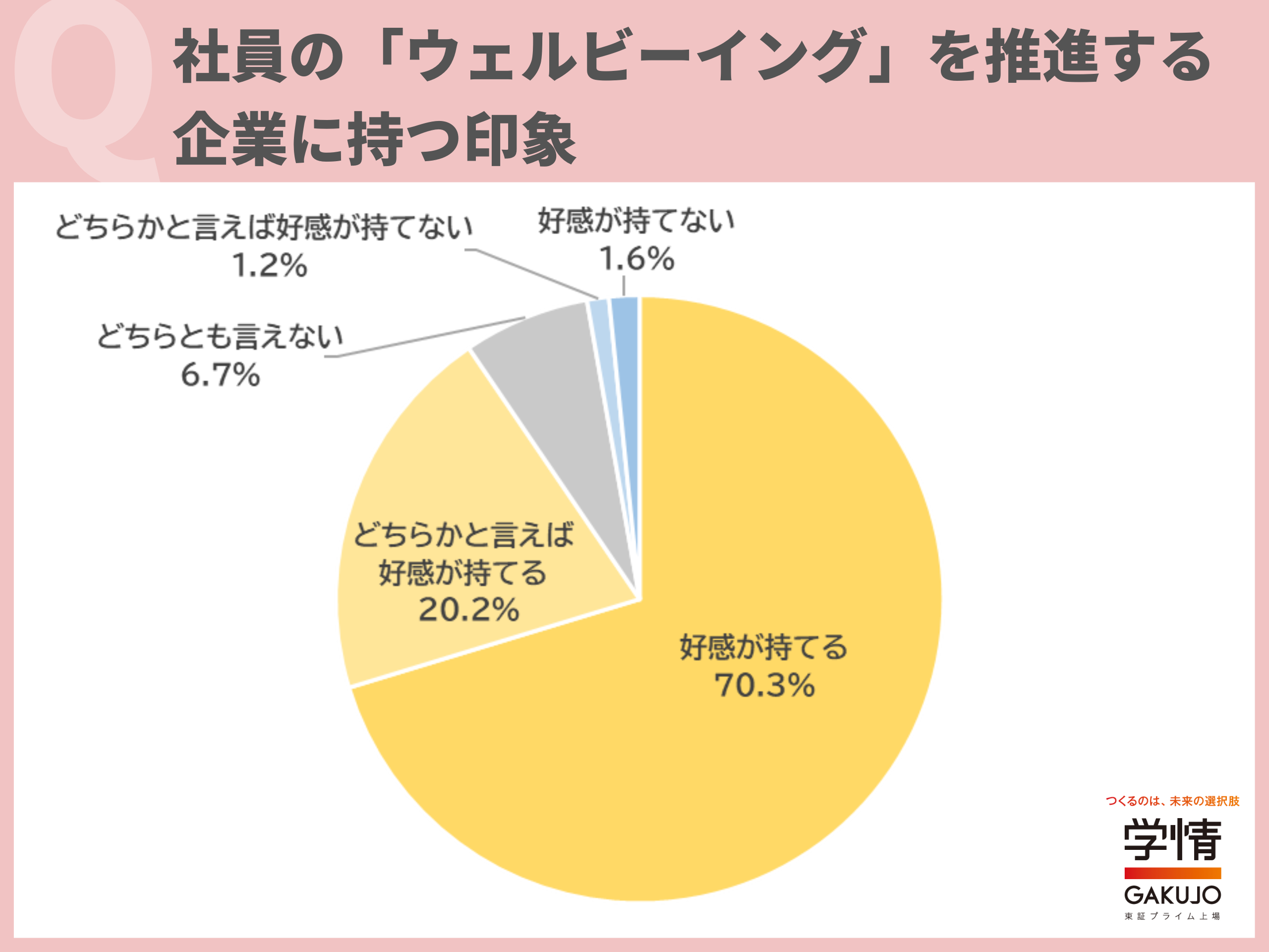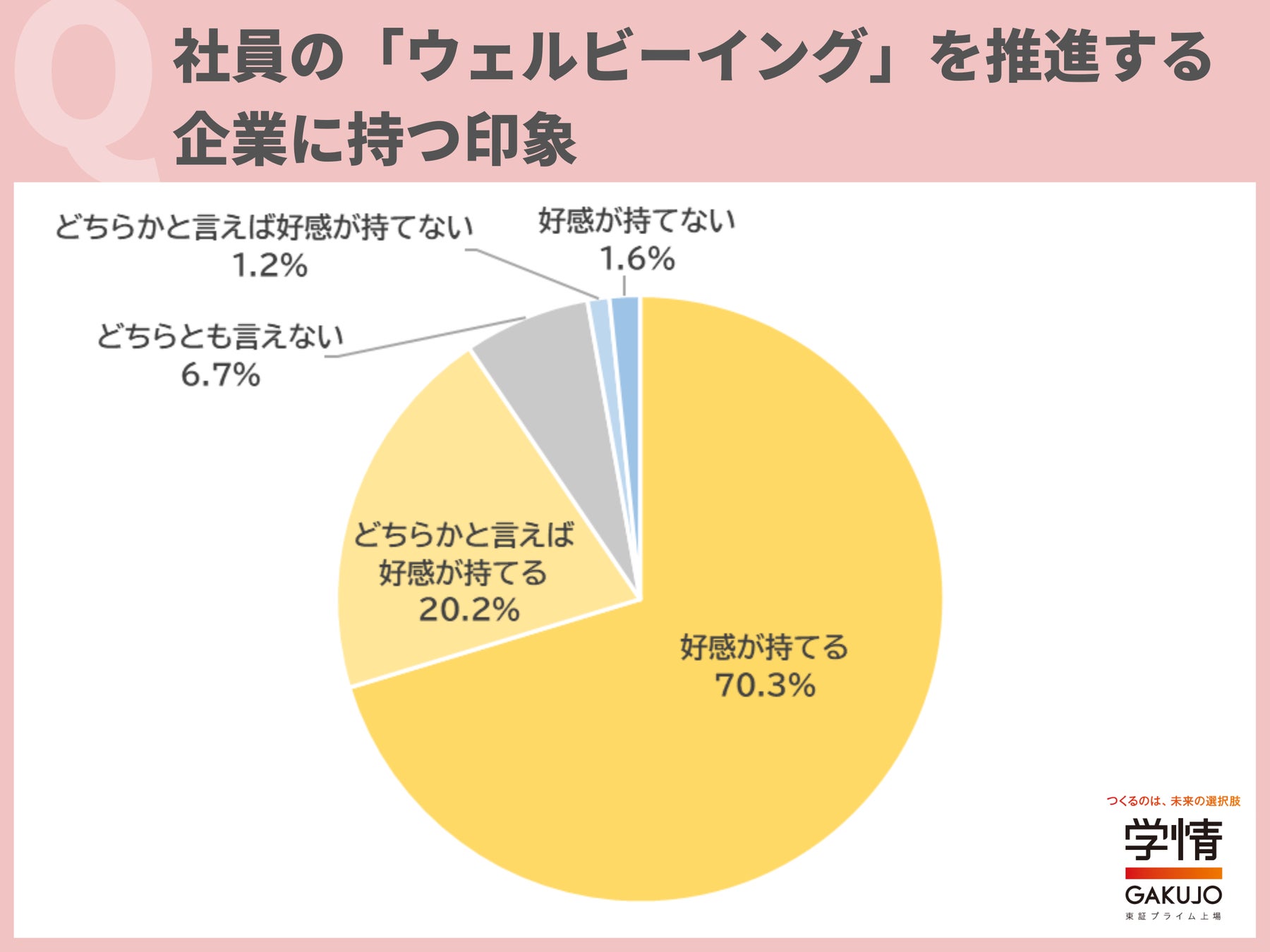 社員の「ウェルビーイング」を推進する企業について、「好感が持てる」と回答した学生が70.3%に上りました。「どちらかと言えば好感が持てる」20.2%と合わせると、9割を超える学生が「ウェルビーイング」を推進する企業に好感を持っていることが分かります。