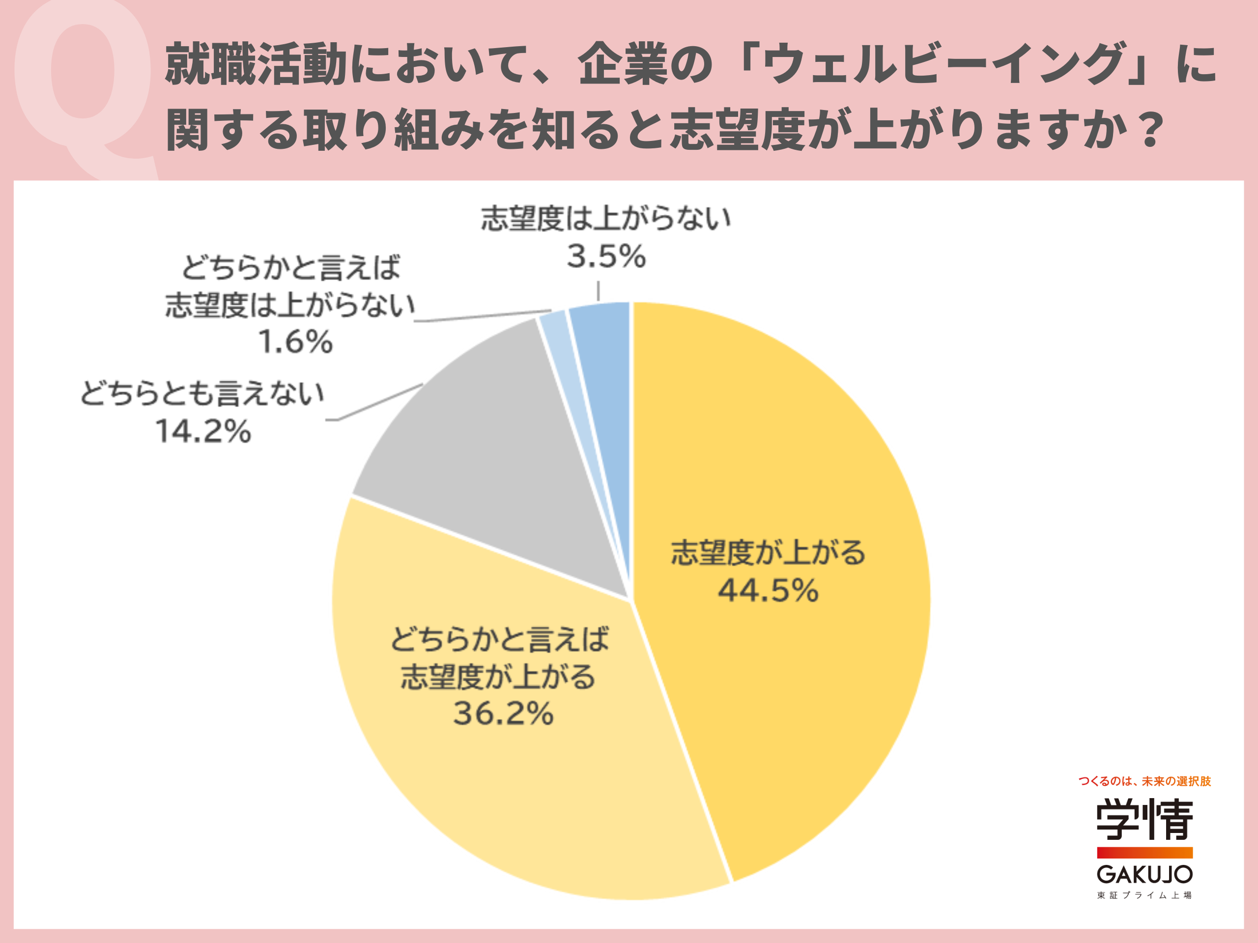 就職活動において、企業の「ウェルビーイング」に関する取り組みを知ると「志望度が上がる」と回答した学生が44.5%に上りました。「どちらかと言えば志望度が上がる」36.2%を合わせると、8割以上の学生が、「ウェルビーイング」に関する取り組みを知ると志望度が上がるとしています。「働きやすい職場だと思う」「仕事内容や経験できることが同じなら、より健康的に働ける職場を選びたい」「やりがいを感じながら、長く働くことができると思う」といった声が寄せられています。