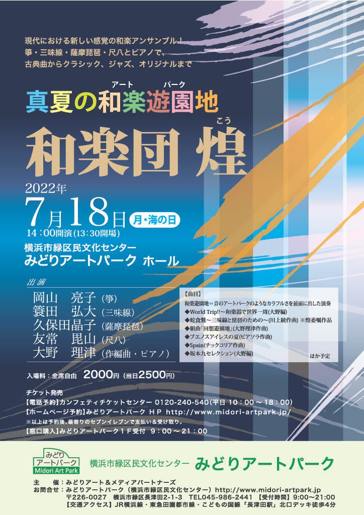 その他、和楽団 煌のために書いてくださった、川上統氏作曲の「蛇食鷲」(三味線と琵琶の二重奏)、大野作曲の「回想遊園地」(みどりアートパーク改編新作)、ほか皆様に聴き馴染みのある曲を予定しています。